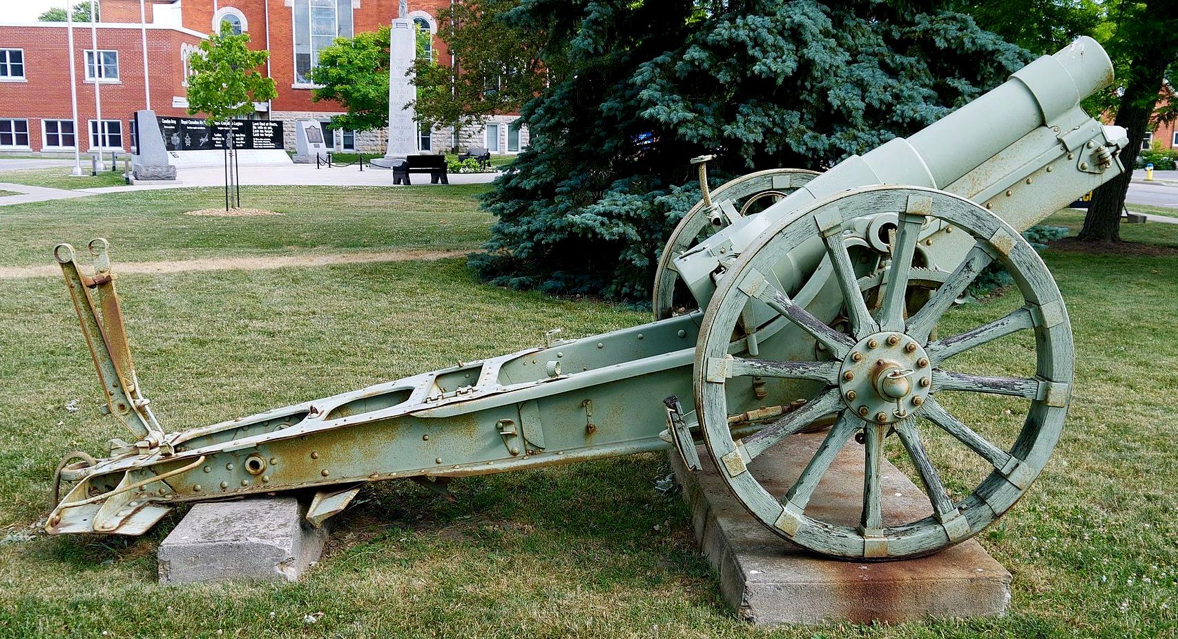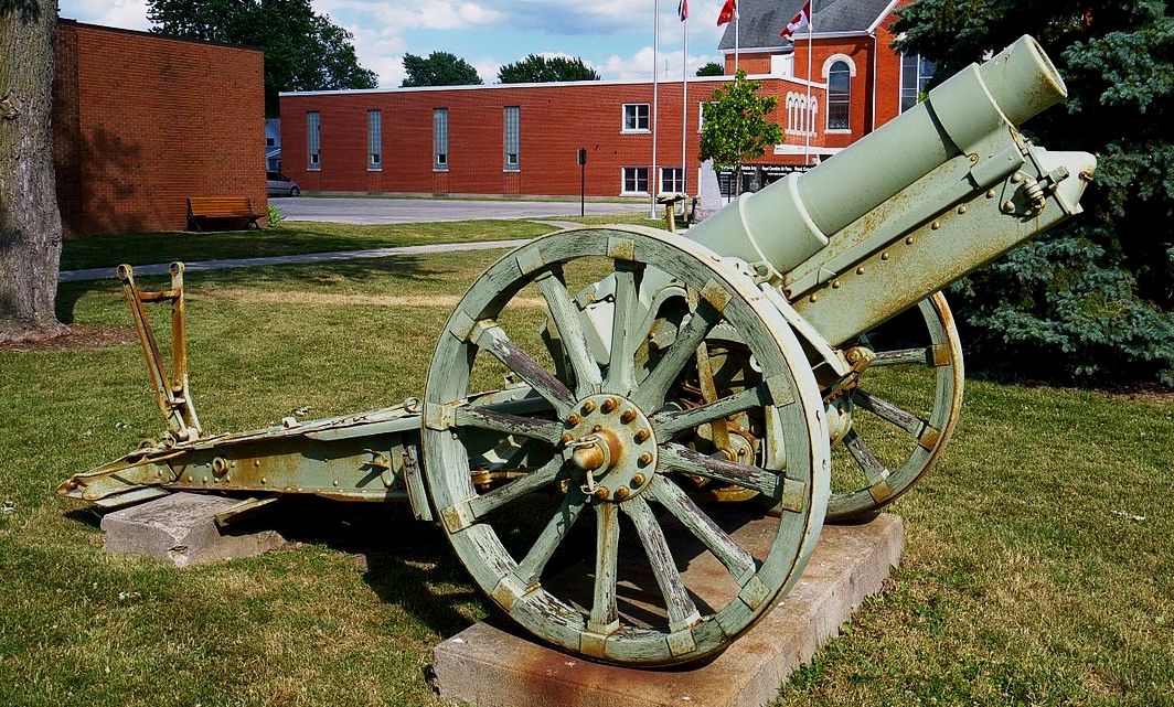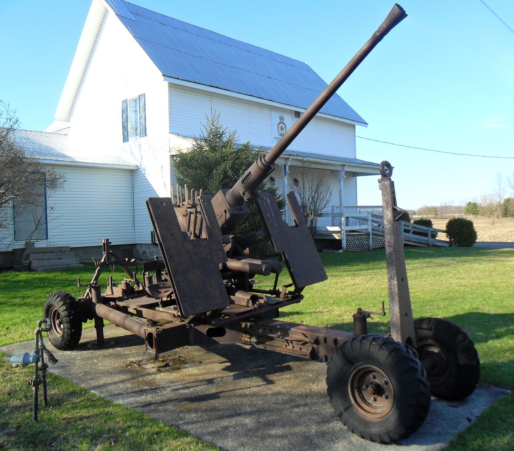 Ordnance QF 40-mm Bofors Anti-Aircraft Gun, mounted on a wheeled carriage, in front of Royal Canadian Legion.