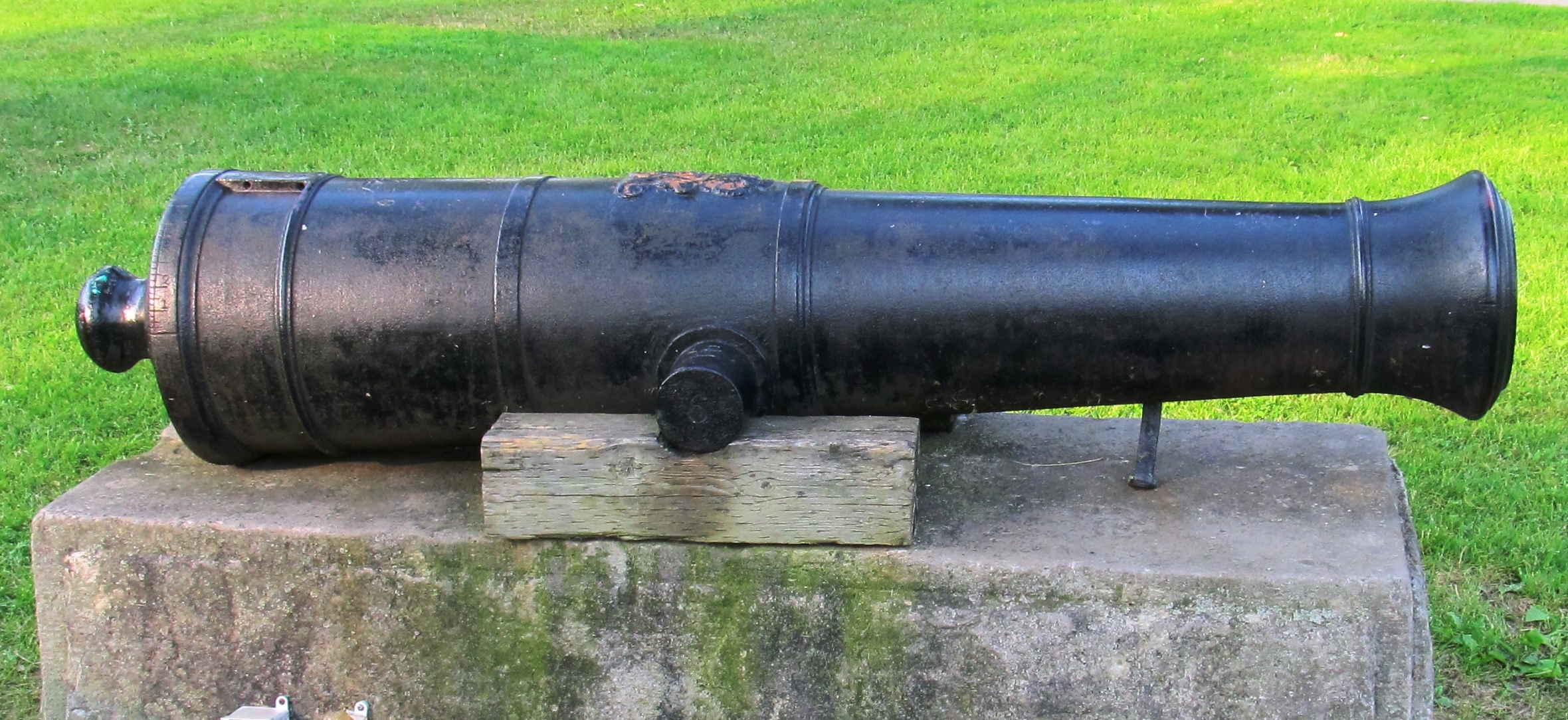 Cast Iron 24-pounder 20-cwt Smoothbore Muzzleloading Gun, weight 20-3-0 (2,324 lbs), 1847, mounted on a stone and concrete stand, No. 1 of 2, located in Central Park with one on the North side of the park at the intersection of Cedar Street and Broad Street West.
