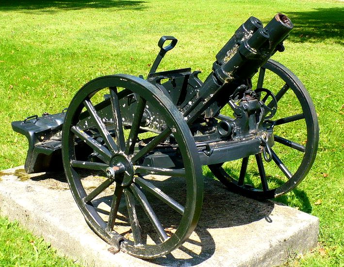 German First World War 17-cm mittlerer Minenwerfer (17-cm mMW), (Serial Nr. 1682), mounted on iron wheels, captured by the 13th Battalion.  City Park.