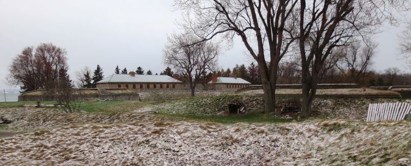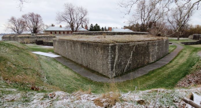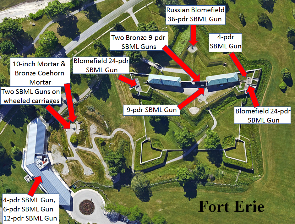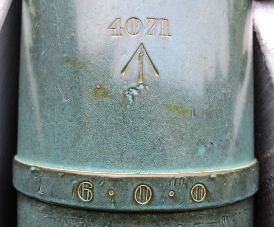 Bronze 9-pounder Smoothbore Muzzleloading Gun, weight 6-0-0 (672 lbs), V14 over DLVIII on the left trunnion, 1859 on the right trunnion, F.M. EARDLEY-WILMOT (Frederick Marow Eardley-Wilmot)(Superintendant of the Royal Gun Factory at Woolwich, England cypher over Queen Victoria cypher, DIEU ET MON DROIT, broad arrow mark, Serial No. 4071, mounted on a naval gun carriage, inside Fort Erie, No. 2 of 2.