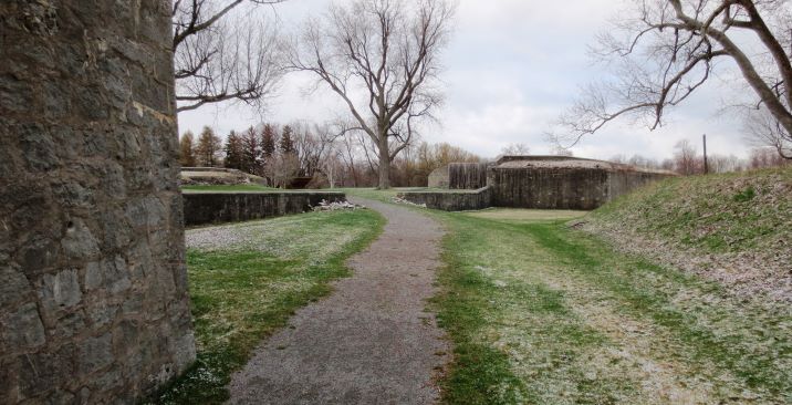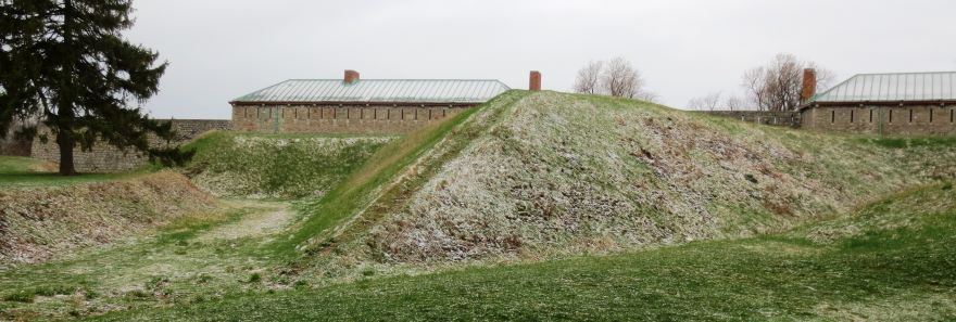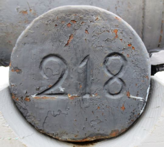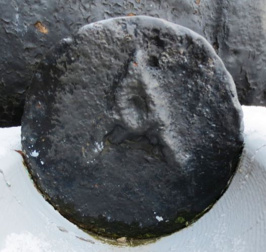 Cast Iron 4-pounder Smoothbore Muzzleloading Gun, no cypher, no markings, mounted on a naval gun carriage, on a redoubt facing West.
