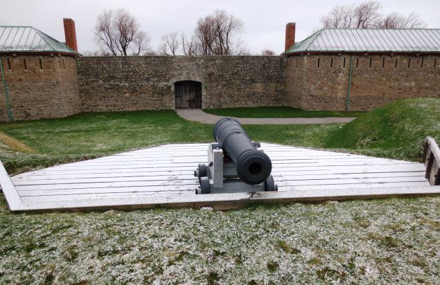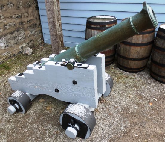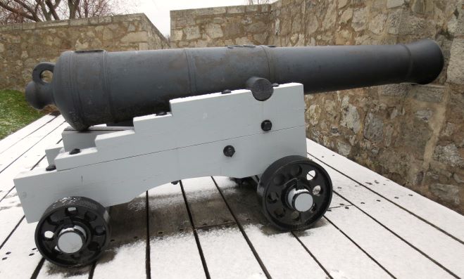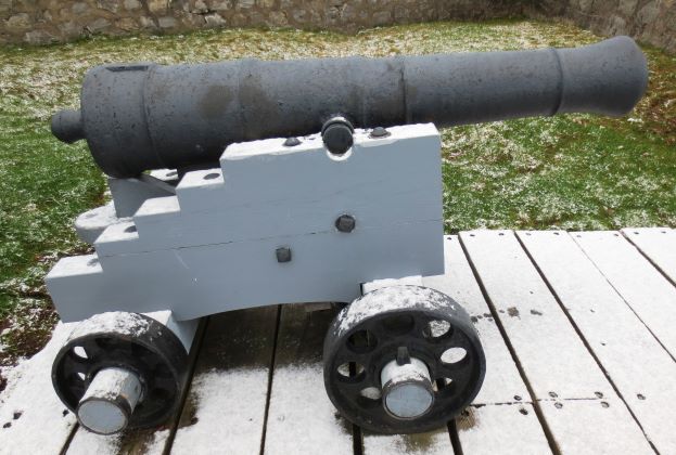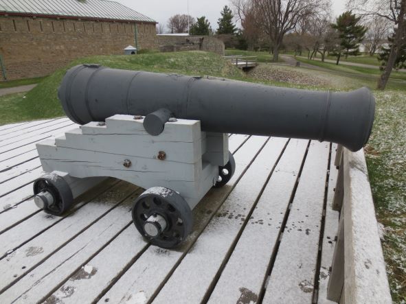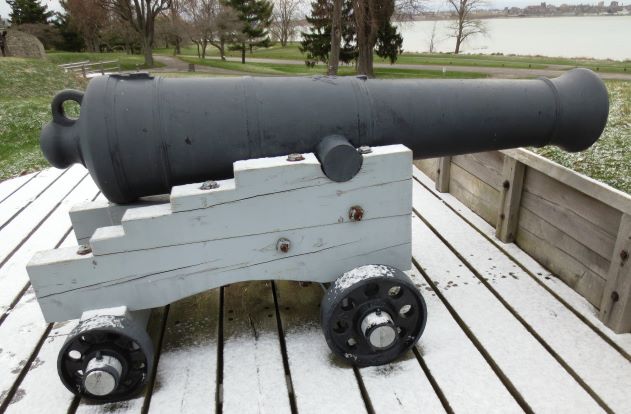Cast Iron 9-pounder Smoothbore Muzzleloading Gun, weight 16-2-20 (1,860 lbs), Crown over P on the barrel, R, A on right trunnion, mounted on a wood naval gun carriage, inside Fort Erie.