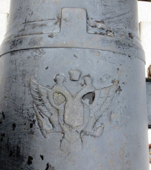 Russian Blomefield pattern Cast Iron 36-pounder Smoothbore Muzzleloading Gun, made by Armstrong, at Alexandrovski, with double-headed Eagle, Crimean War trophy. ML, (Serial No. 433G), 1632P, 1835. Mounted on a wood naval gun carriage located on a redoubt facing south inside Fort Erie.