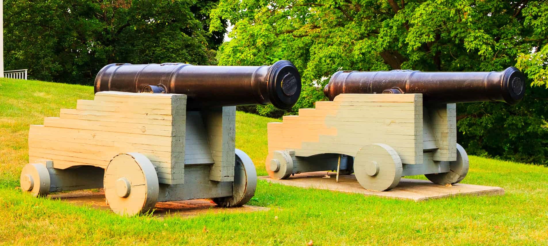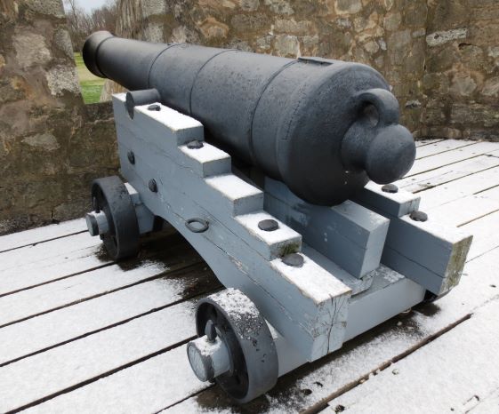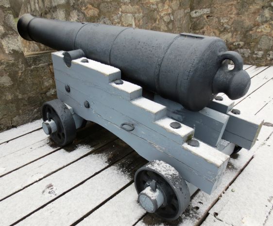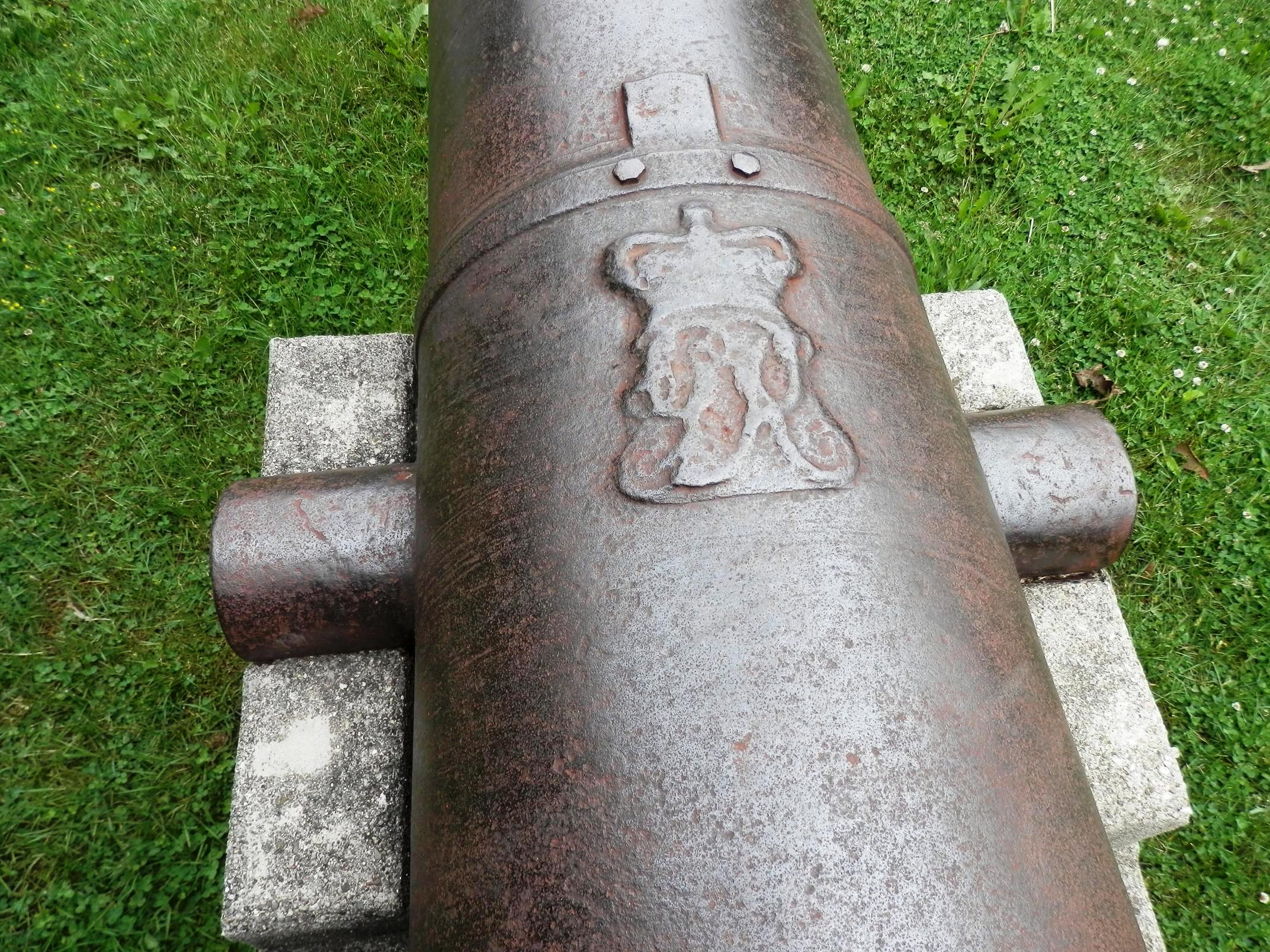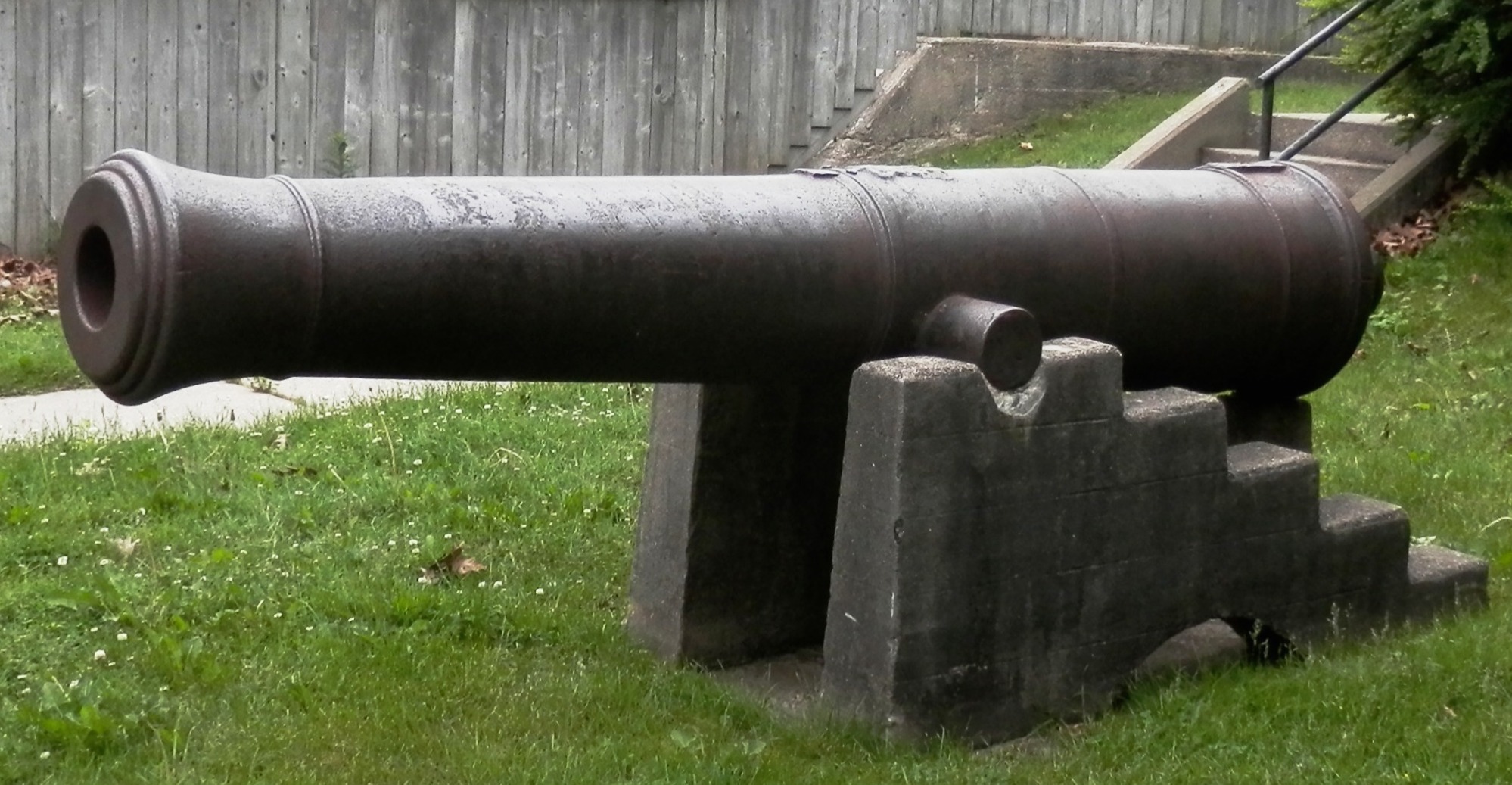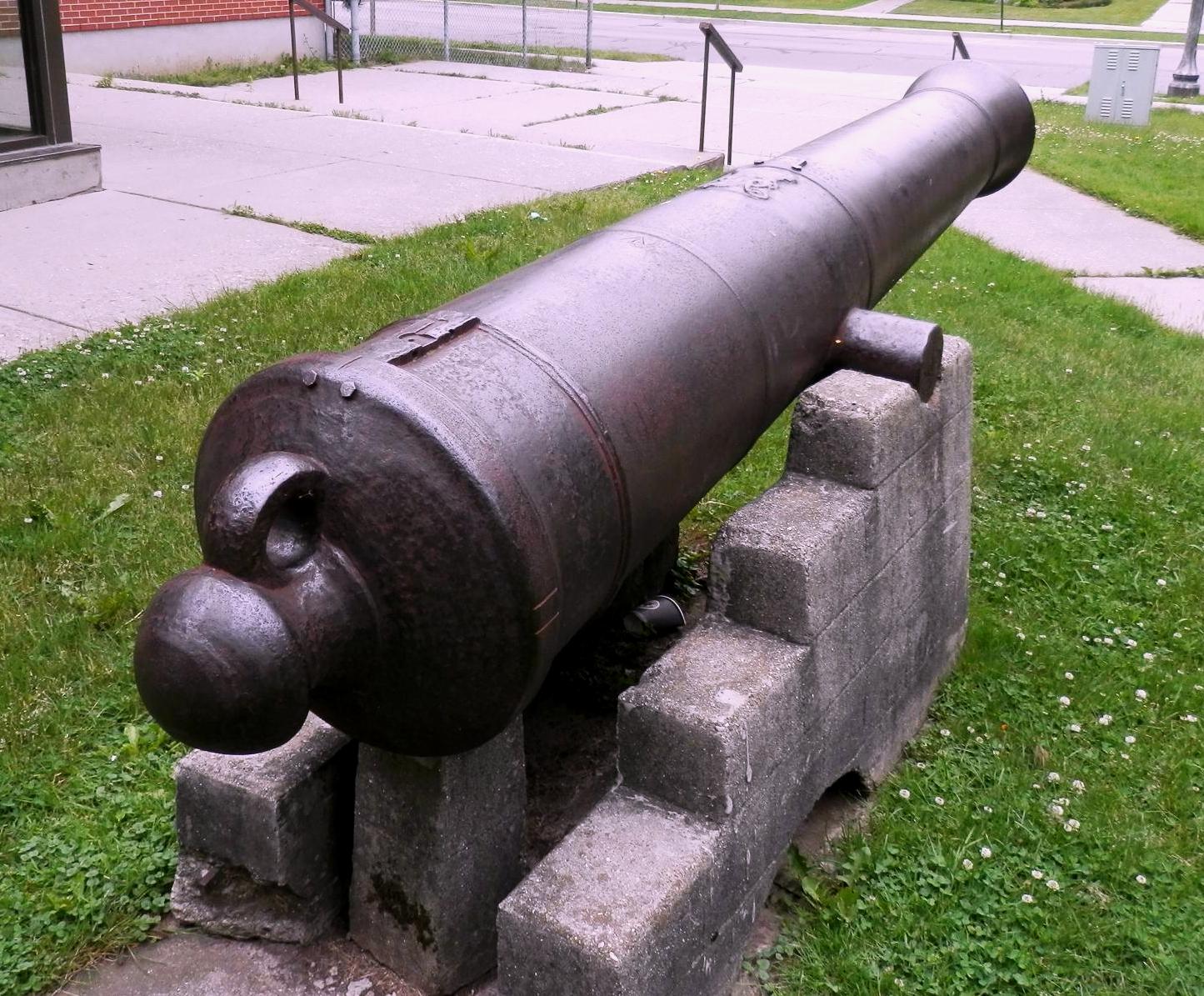 Blomefield Cast Iron 24-pounder 50-cwt Smoothbore Muzzleloading Gun, weight 50-2-25 (5,681 lbs), (Serial No. 7104, CARRON, 1807) Carron of Falkirk, Scotland, on the left trunnion, (24P) on the right trunnion, King George III cypher, broad arrow mark. Burlington Heights, Hamilton Military Museum.