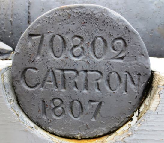 Blomefield Cast Iron 24-pounder 50-cwt Smoothbore Muzzleloading Gun, weight 51-2-7 (5,775 lbs), 1807, (Serial No. 708990, CARRON, 1807) Carron of Falkirk, Scotland, on the left trunnion, (24P) on the right trunnion, King George III cypher, broad arrow mark, mounted on a wood naval gun carriage. Joel Stone Heritage Park, Water Street and Kate Street