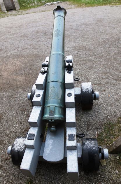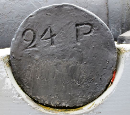 Blomefield Cast Iron 24-pounder 20-cwt Smoothbore Muzzleloading Gun, weight 21-3-22 (2,458 lbs, weight of a 6-pounder), J & H (John & Henry King), 1846, King George III cypher, short ship’s gun re-bored to 24-pounder in 1844. Battery Lodge southeast, Hamilton Military Museum.