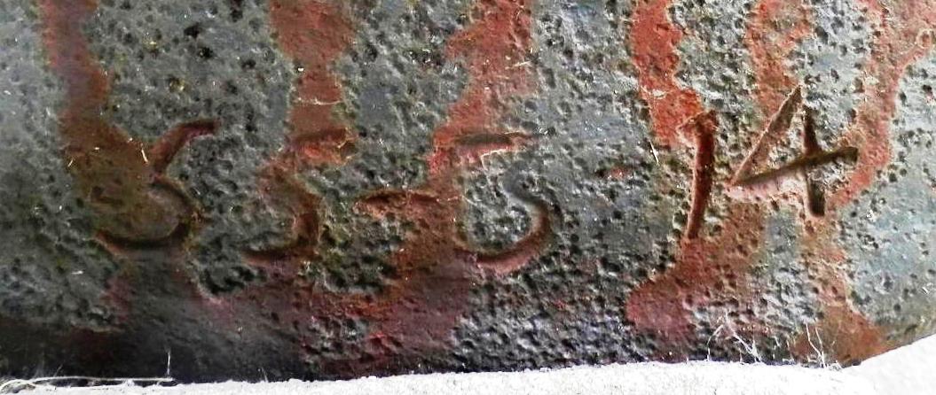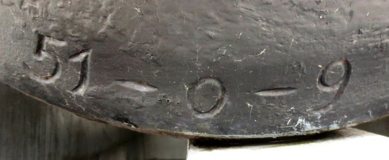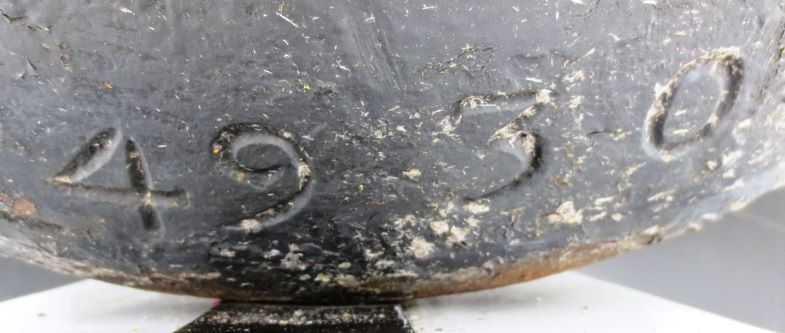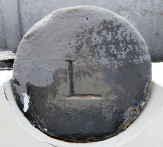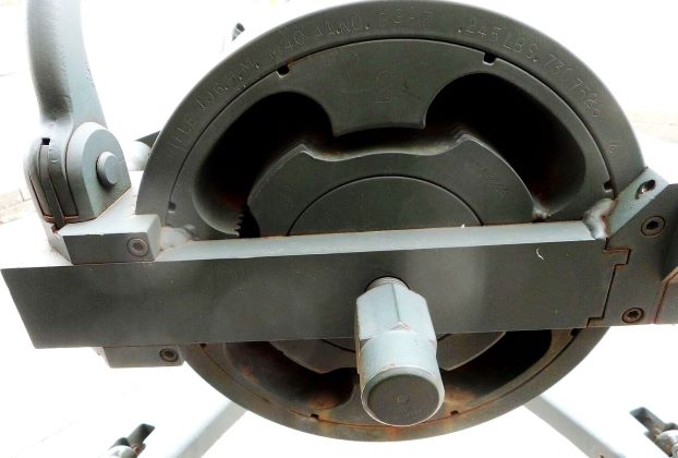 3 inch/50 QF Twin Guns Mk. 33, Left gun markings: Bu. of Ord. 3-in using Mk 8 Mod 2, W.T. 495 lbs. Serial No. (illegible due to rust), U.S. Naval Ordnance, Canton (illegible in many spots). Right gun markings: U.S. Navy – Bu. of Ord. 3in using Mk 8 Mod 2, W.T. 495 lbs. Serial No. 13202, G.M. Corp. Fisher Body DIV. R.J.G, Detroit Michigan, 1950.