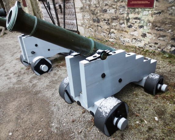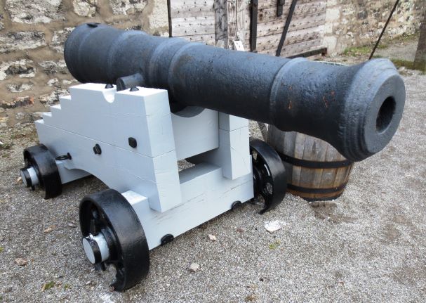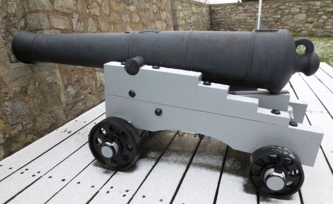 Blomefield Cast Iron 24-pounder 50-cwt Smoothbore Muzzleloading Gun, weight 49-3-0 (5,572 lbs) under the cascabel, (L) Low Moor, England, on the left trunnion, (Serial No. 218) on the right trunnion, King George III cypher, broad arrow mark, mounted on a wood naval gun carriage, on a redoubt facing West.