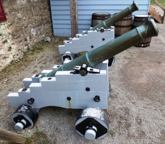 Cast Iron 6-pounder Smoothbore Muzzleloading Gun, mounted on a wooden carriage, King George II cypher, H & S No. 1. This gun stands on the right side of the 24 pounder (possible replica). Joel Stone Heritage Park, Water Street and Kate Street.