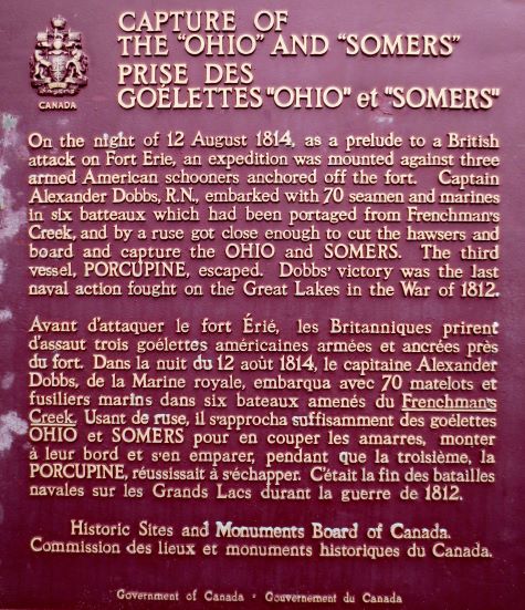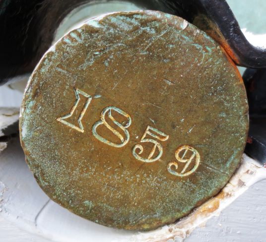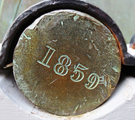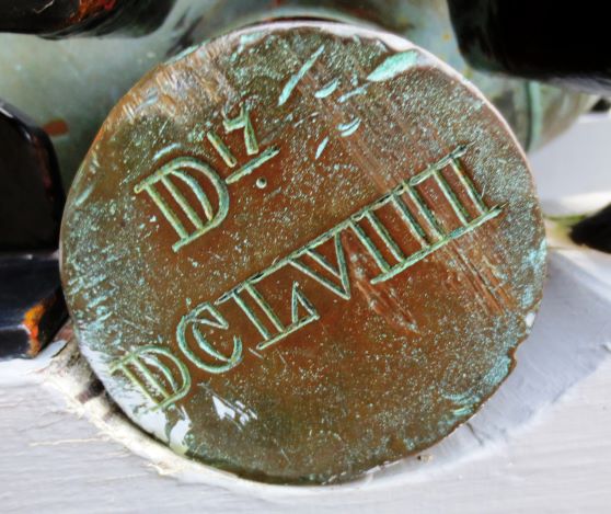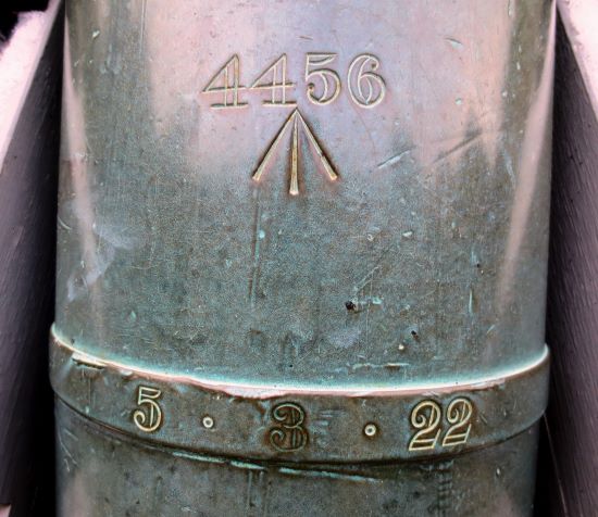 Bronze 9-pounder Smoothbore Muzzleloading Gun, weight 5-3-22 (666 lbs), D17 over DLCVIII on the left trunnion, 1859 on the right trunnion, F.M. EARDLEY-WILMOT (Frederick Marow Eardley-Wilmot)(Superintendant of the Royal Gun Factory at Woolwich, England cypher above the Queen Victoria cypher, DIEU ET MON DROIT, broad arrow mark, Serial No. 4456, mounted on a naval gun carriage, inside Fort Erie, No. 1 of 2.