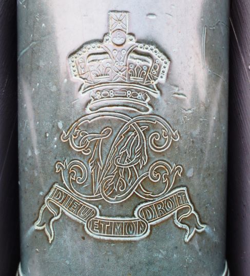 Bronze 9-pounder Smoothbore Muzzleloading Gun, 1820, King George III cypher. Battery Lodge north. Hamilton Military Museum.