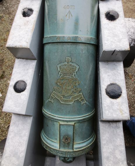 Blomefield Cast Iron 32-pounder 56-cwt Smoothbore Muzzleloading Gun, weight 55-3-14 (6,258 lbs), (WCo), (Walker & Company of Rotherham, Yorkshire, England), on the left trunnion, (Serial No. 182) on right trunnion, King George III cypher, broad arrow mark, MCMXXV. Mounted on a concrete stand near the Lighthouse.