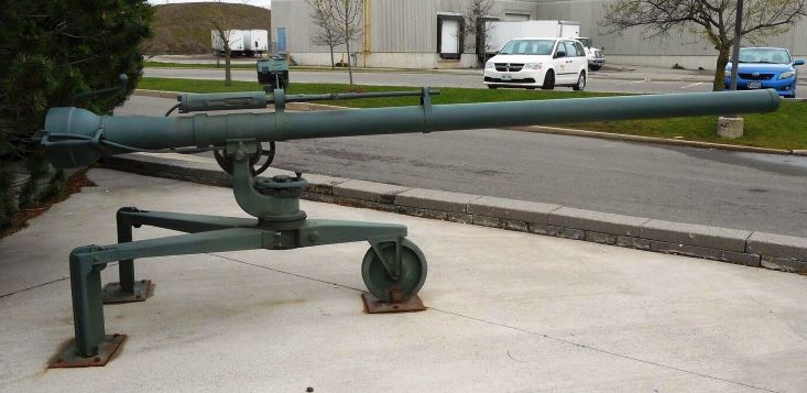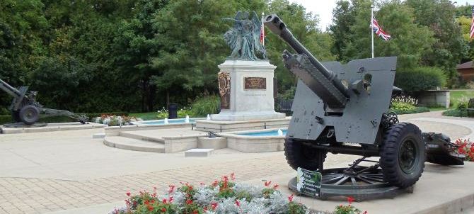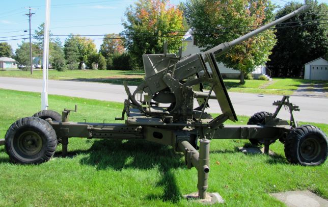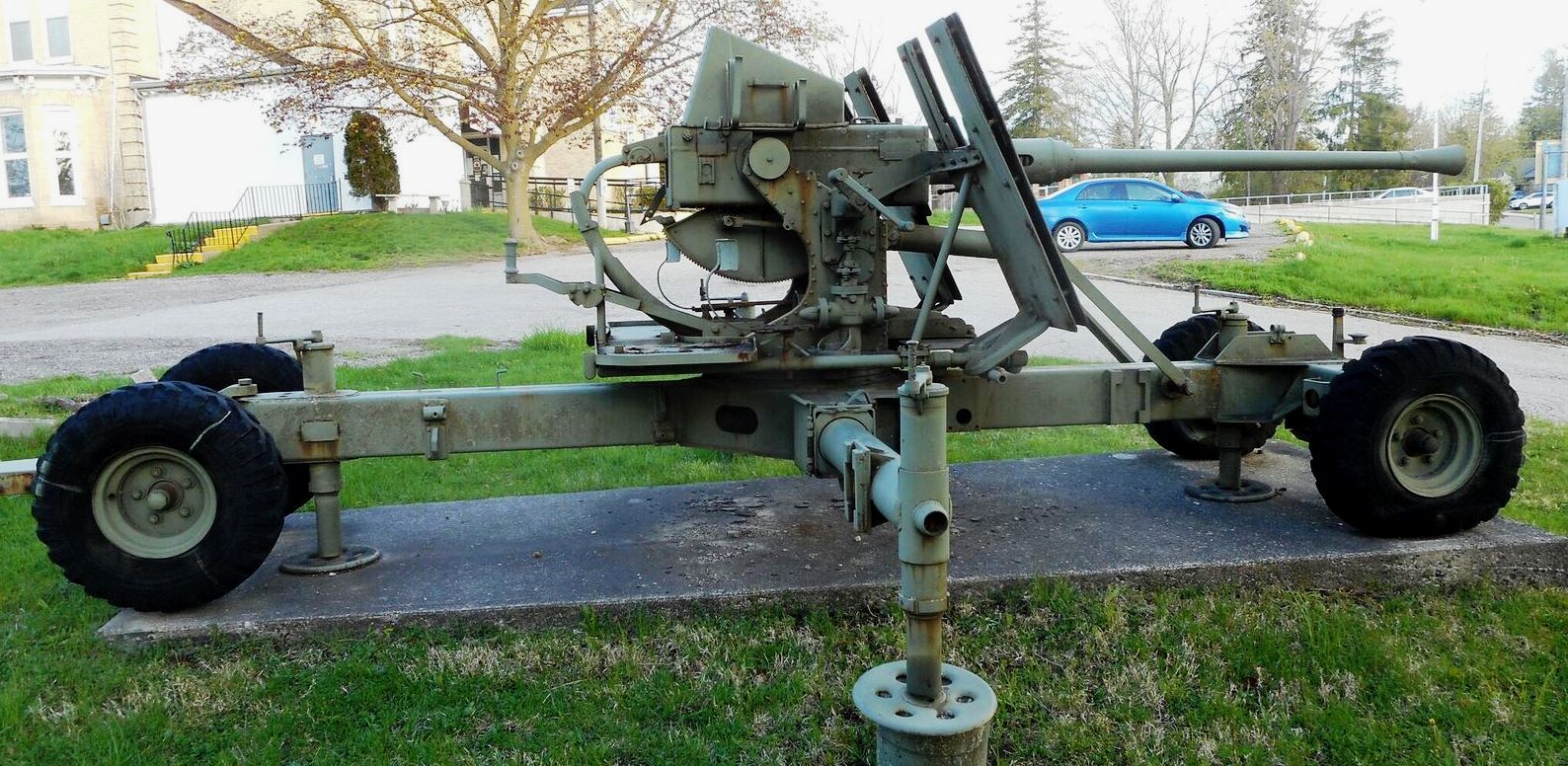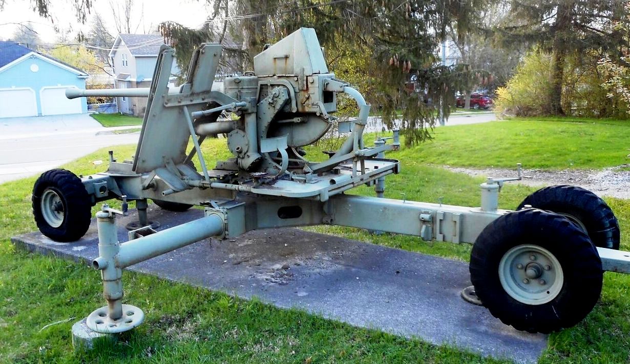Single Bofors 40-mm Boffin Light Anti-aircraft Gun, mounted on a wheeled carriage, (Serial No. P-17441), O.F.E./C. Royal Canadian Legion Branch No. 370, 24 Dundas Street.