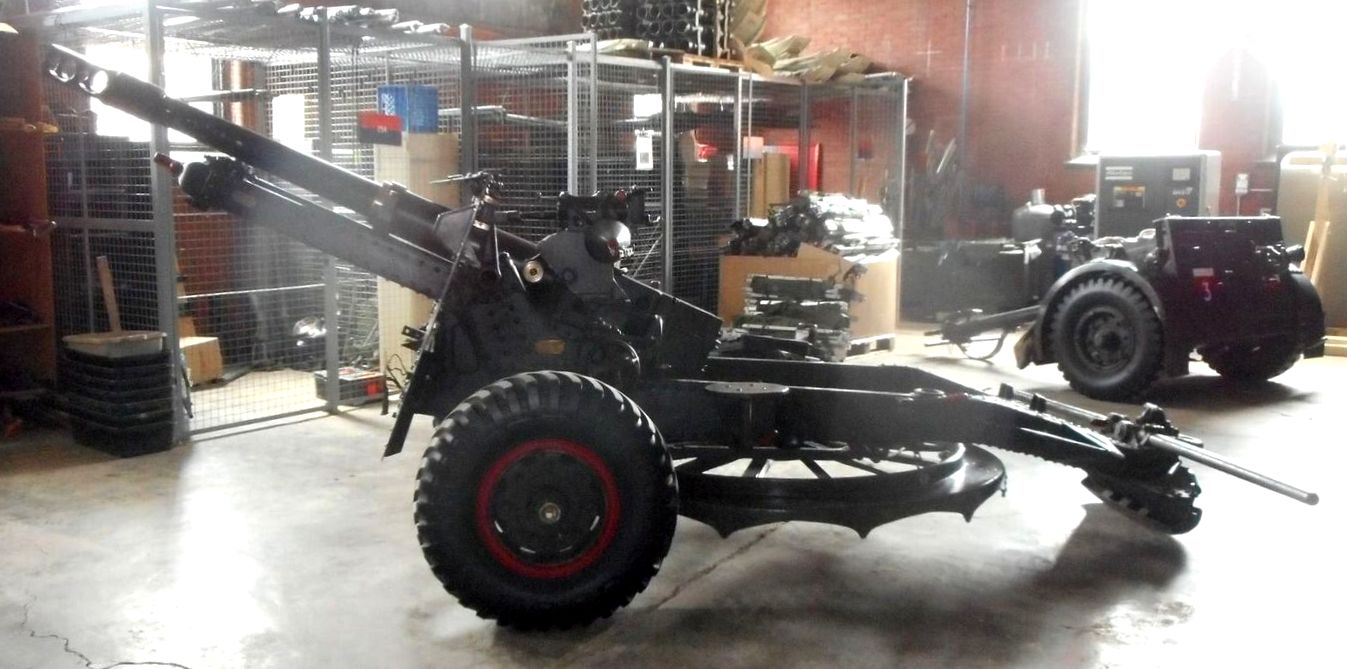 Ordnance Quick-Firing (QF) 25-pounder (87.6-mm/3.45-inch) Field Gun, C Mk. 2 with No. 9 circular firing platform, Limber and Field Artillery Tractor, Artillery Support Group.