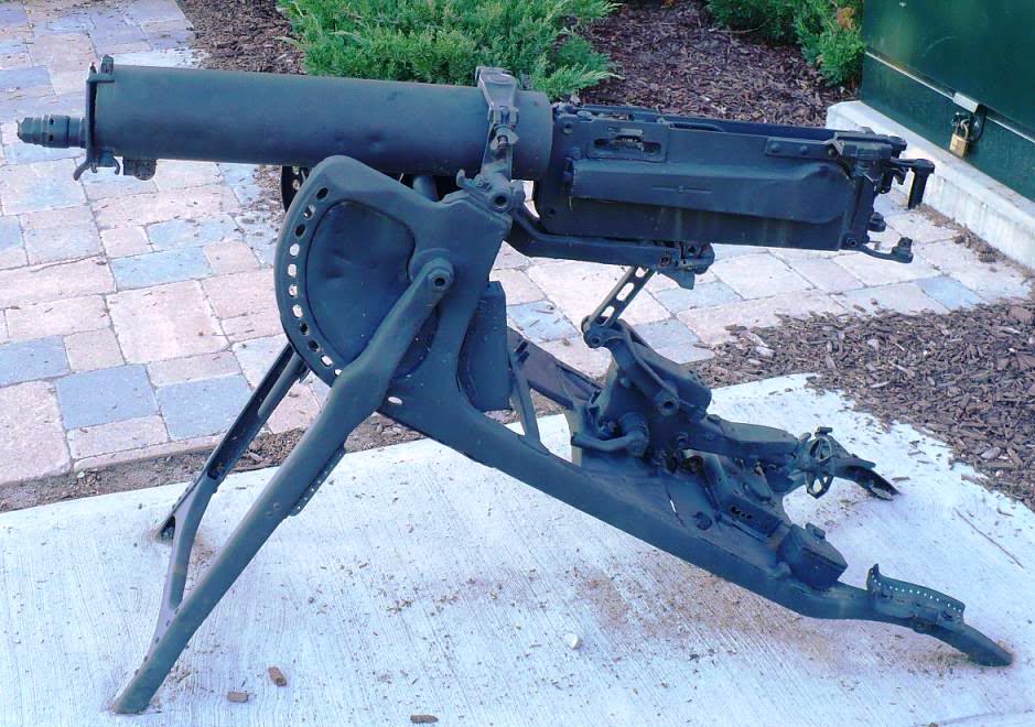 German First World War 7.92-mm Maxim Spandau MG 08 Machinegun (Serial Nr. 13366), mounted on a Schlitten stand.