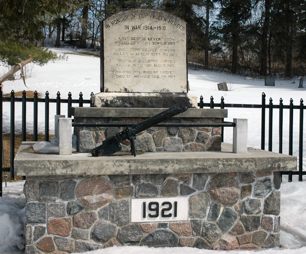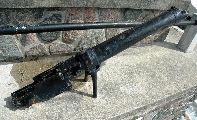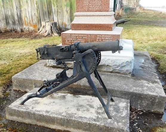 German First World War 7.92-mm Maxim Spandau MG 08 Machinegun (Serial Nr. 2393), mounted on a Schlitten stand. Originally allocated to Rawdon, Ontario, no record. No. 1 of 2 MG 08s mounted beside the war memorial.