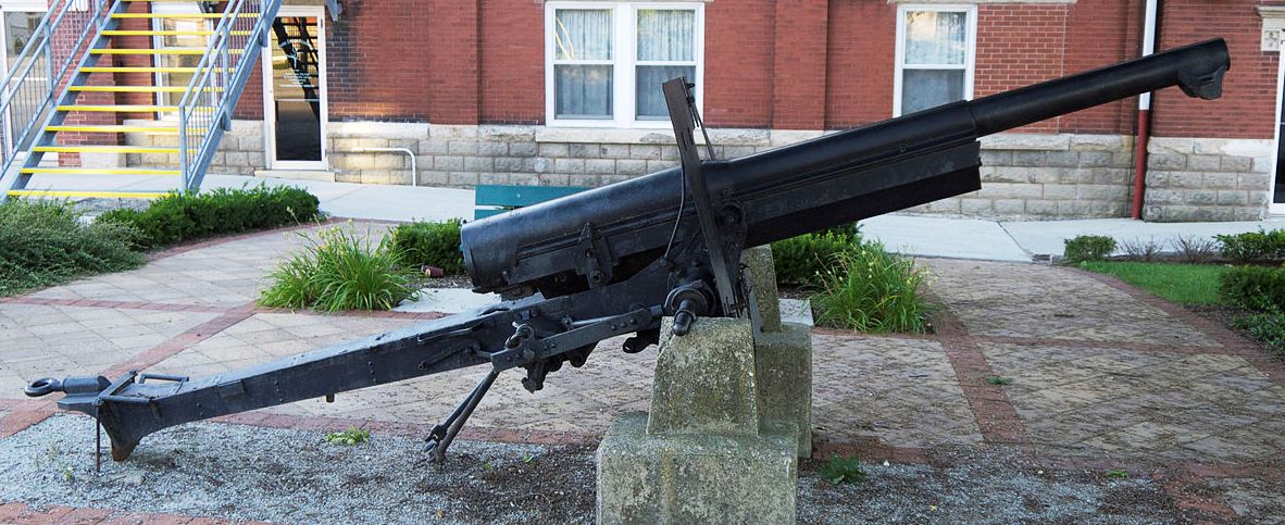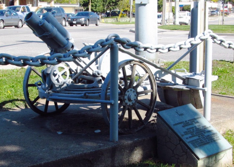German First World War 7.58-cm leichtes Minenwerfer neuer Art, (7.58-cm leMW), possibly (Serial Nr. 6170), mounted on wheels on a concrete stand, Centennial Park, on the SW corner of Main St and Ontario St. (Hwy 21).