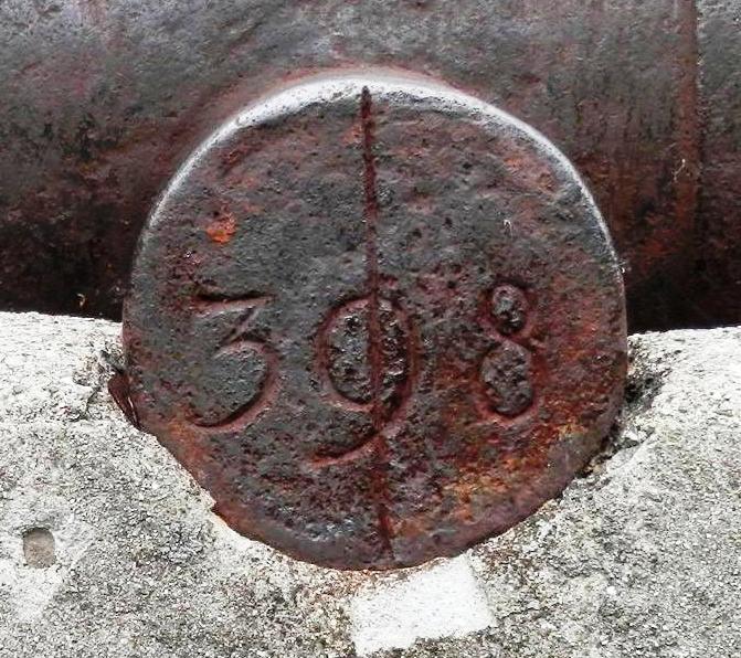 Blomefield Cast Iron 32-pounder 56-cwt Smoothbore Muzzleloading Gun, 55-3-14 (6,258 lbs) under the cascabel, (WCo), (Walker & Company of Rotherham, Yorkshire, England), on the left trunnion, (Serial No. 398) on right trunnion, King George III cypher, broad arrow mark, bore diameter 6.5”, mounted on a concrete stand. No. 2, Victory Memorial Park Public School (closed), 210 Thames Street South. Both of these guns have been donated to the Ingersoll Cheese and Agricultural Museum.