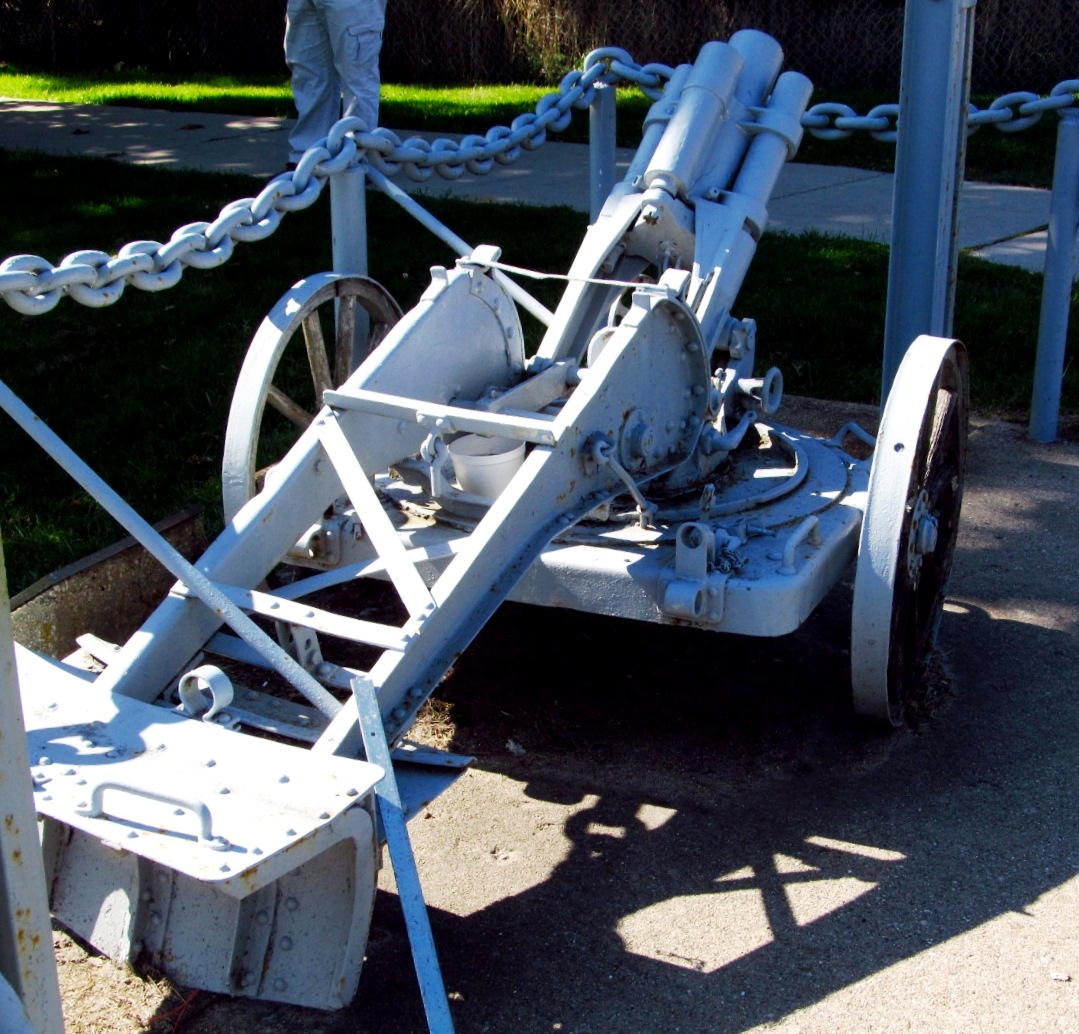 Single Bofors 40-mm Boffin Light Anti-aircraft Gun, Serial No. L31098 (Breech plate has a date of 1945), Midships – Port side forward mount.