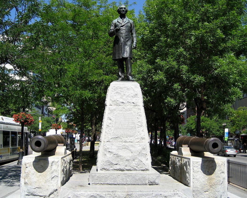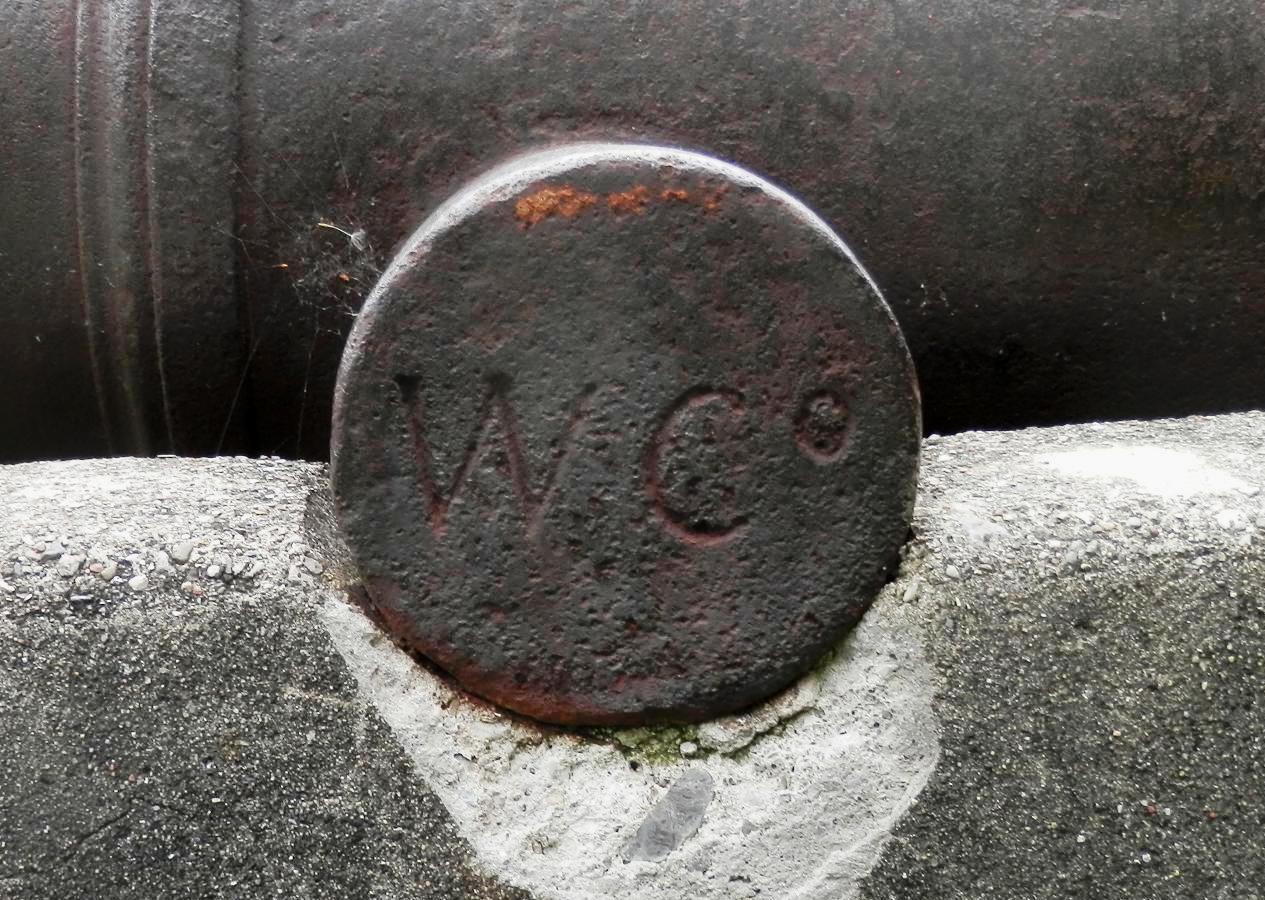 Blomefield Cast Iron 24-pounder 50-cwt Smoothbore Muzzleloading Gun, weight 50-0-11 (5,611 lbs), (WCo), (Walker & Company of Rotherham, Yorkshire, England), on the left trunnion, (Serial No. 130) on right trunnion (concealed by concrete), King George III cypher, broad arrow mark, mounted on a concrete stand. These two guns are located in Gore park, beside the Sir John A. MacDonald statue, at the corner of King and John Street. No. 2 of 2.