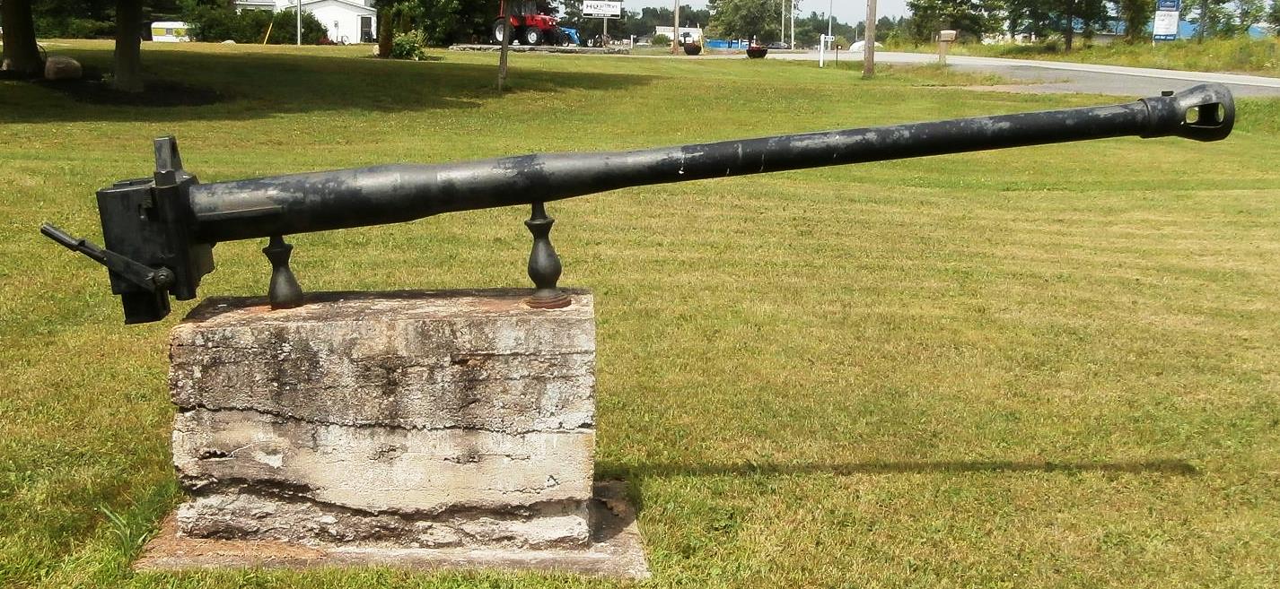 Ordnance Quick-Firing (QF) 6-pounder 7-cwt (57-mm) Anti-Tank Gun, barrel and breech mounted on a concrete stand in front of Higginson Powder Ltd, on County Rd 34 just south of the town.