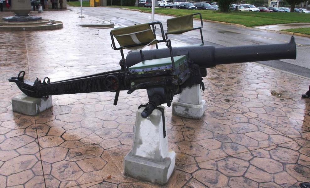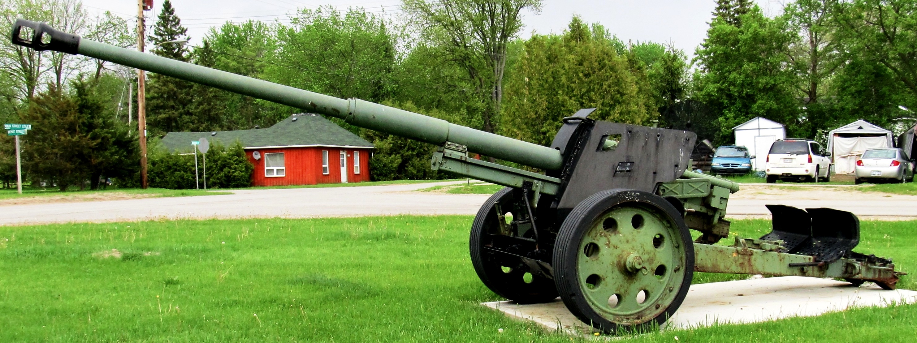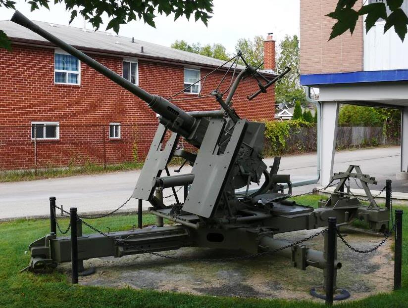 Single Bofors 40-mm Boffin Light Anti-aircraft Gun, on display on 3rd Street, east of Cawthra Road, in front of the A.N.A.F. Club.