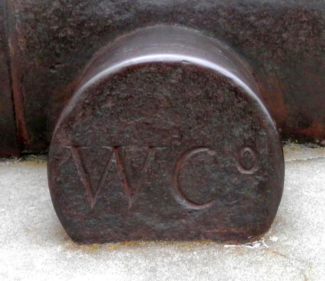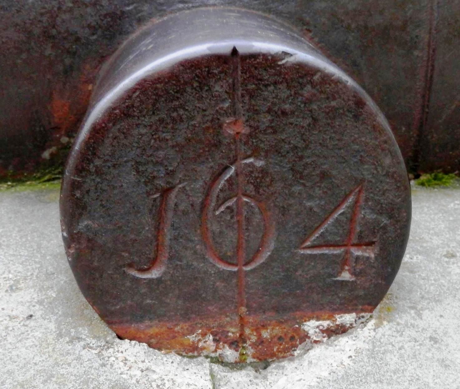Blomefield Cast Iron 32-pounder 56-cwt Smoothbore Muzzleloading Gun, weight 56-0-7 (6,279 lbs) under the cascabel, (WCo), (Walker & Company of Rotherham, Yorkshire, England), on the left trunnion, (Serial No. 164) on the right trunnion, King George III (1760-1820) cypher, broad arrow mark.  6.5-inch bore diameter, No. 2 gun mounted on a brick and concrete stand in front of the Boer War Memorial, Victoria Park.