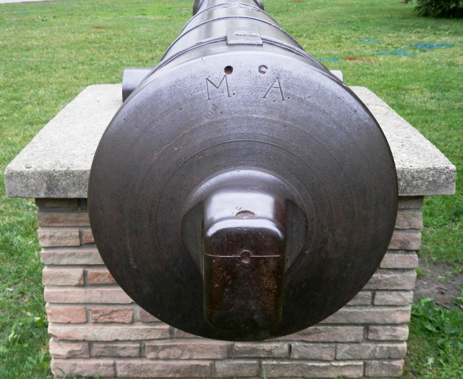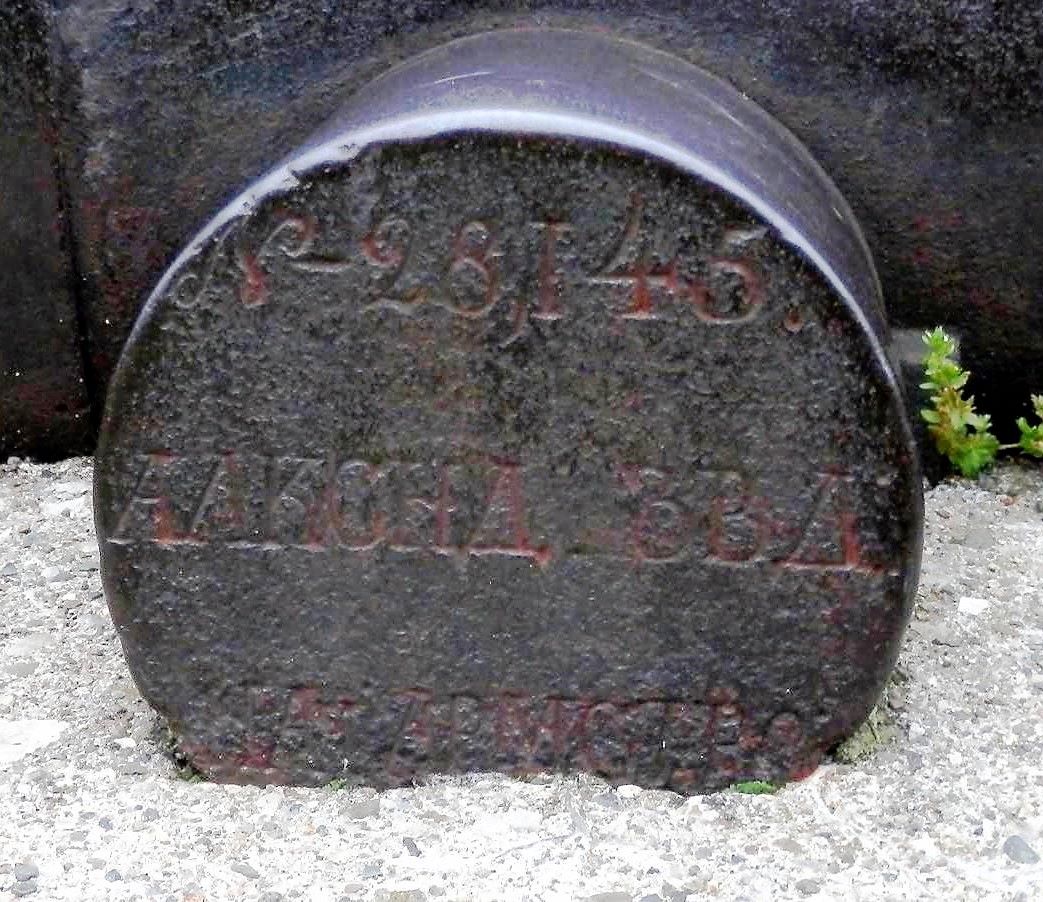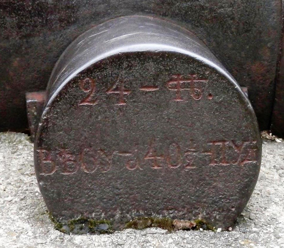 Millar pattern Russian Cast Iron 24-pounder 50-cwt Smoothbore Muzzleloading Gun, (Serial No. 28145) forged by Armstrong at Alexandrovski on the left trunnion, (24P BbCY 140 1/2 P) on right trunnion, double-headed Eagle, Crimean War trophy, MA stamped above the cascabel.  This gun has what appears to be damage from a shell strike on the right side near the breech.  No. 1 gun mounted on a brick and concrete stand in front of the Boer War Memorial, Victoria Park.
