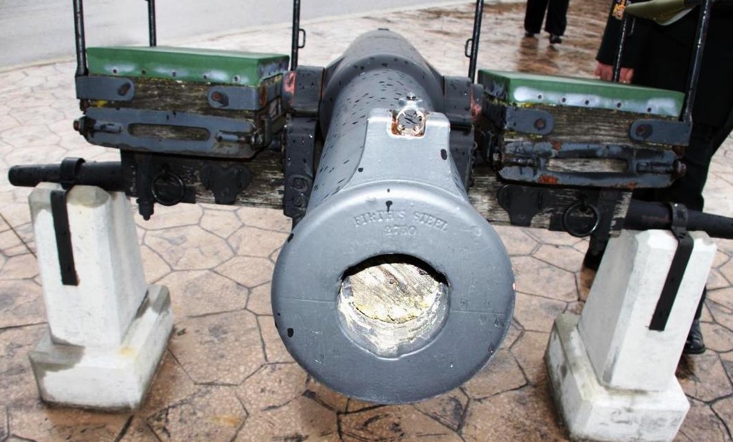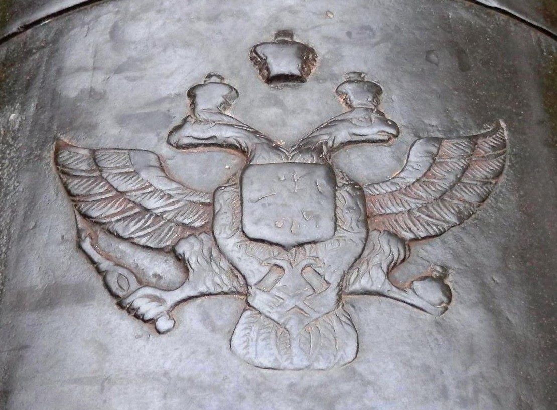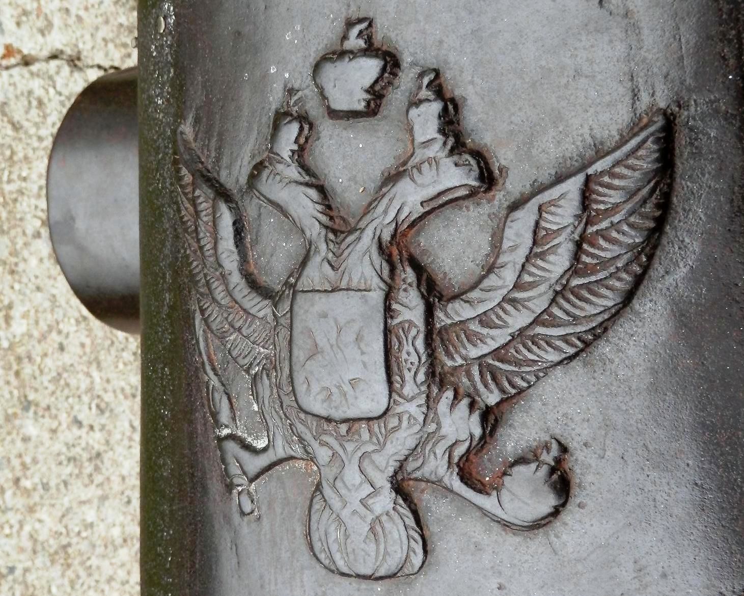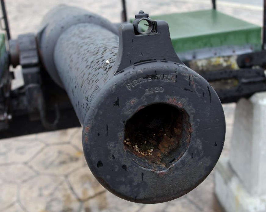 Millar pattern Russian Cast Iron 24-pounder 50-cwt Smoothbore Muzzleloading Gun, (Serial No. 28145) forged by Armstrong at Alexandrovski on the left trunnion, (24P BbCY 140 1/2 P) on right trunnion, double-headed Eagle, Crimean War trophy, MA stamped above the cascabel.  This gun has what appears to be damage from a shell strike on the right side near the breech.  No. 1 gun mounted on a brick and concrete stand in front of the Boer War Memorial, Victoria Park.