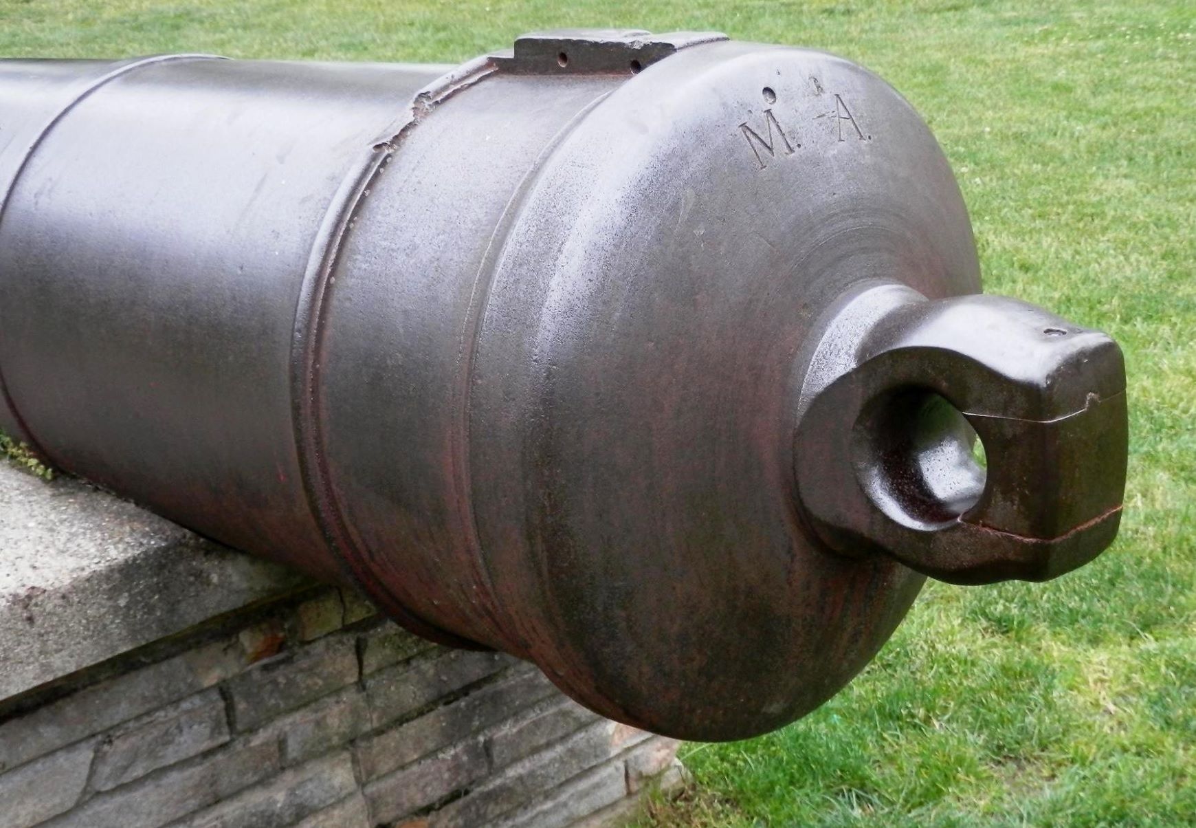 Blomefield Cast Iron 32-pounder 56-cwt Smoothbore Muzzleloading Gun, mounted on a concrete stand in front of the town library near the cenotaph.  No. 2 of 2.