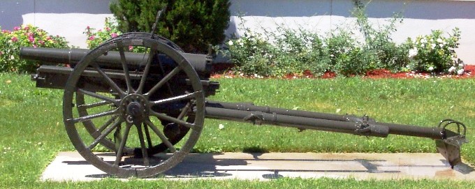 German First World War 15-cm schwere Feldhaubitze 1902 (15-cm sFH 02) Heavy Field Howitzer.  (Serial Nr. 9), missing its wheels, mounted on concrete pylons in a city park.  This gun was captured by the 43rd Battalion on 8 Aug 1918 near Amiens in front of Vignette Wood, South of Demuin, France.