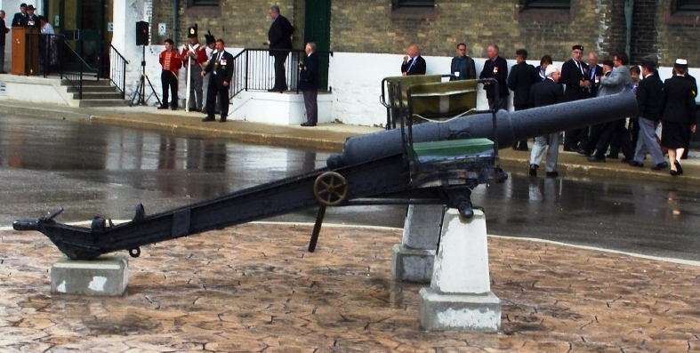 Blomefield Cast Iron 32-pounder 56-cwt Smoothbore Muzzleloading Gun, mounted on a concrete stand in front of the town library near the cenotaph.  No. 1 of 2.