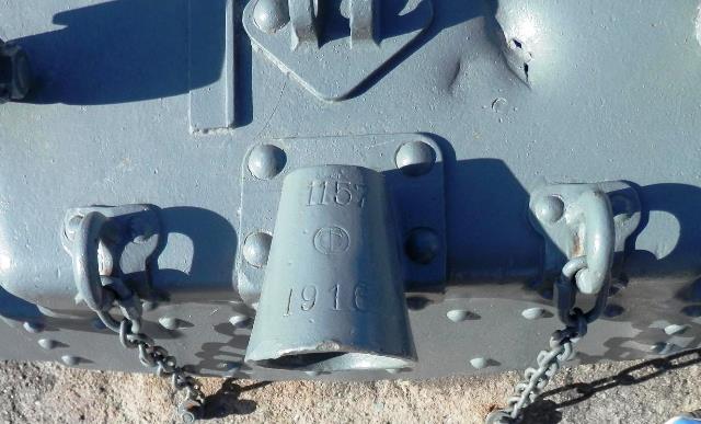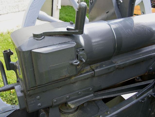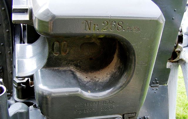 German First World War 7.7-cm Feldkanone 96 neuer Art (7.7-cm FK 96 n.A.), (Serial Nr. 268).  There is no official record of this gun.  It is stamped R.268.  L.393.  AWDr. On the right side below the breech, and gef. 1898. Fr. Kp. abg. 1907. F.F.E. under the breech.