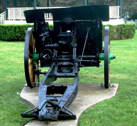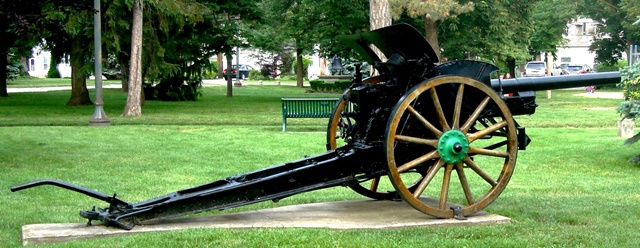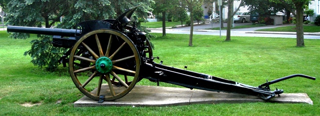 German First World War 7.7-cm Feldkanone 96 neuer Art (7.7-cm FK 96 n.A.), (Serial Nr. 2542), Kaiser Wilhelm I cypher.  This gun was captured by the 2nd Canadian Mounted Rifles on 26 August 1918 near Monchy, France.  It was put back into action by the 66th Battery CFA, NW of Monchy-le-Preux.  It stands beside the First World War Memorial in front of the South Dundas Justice Building.