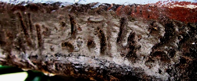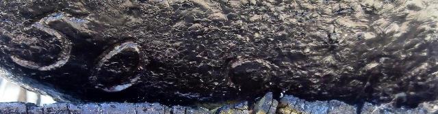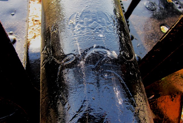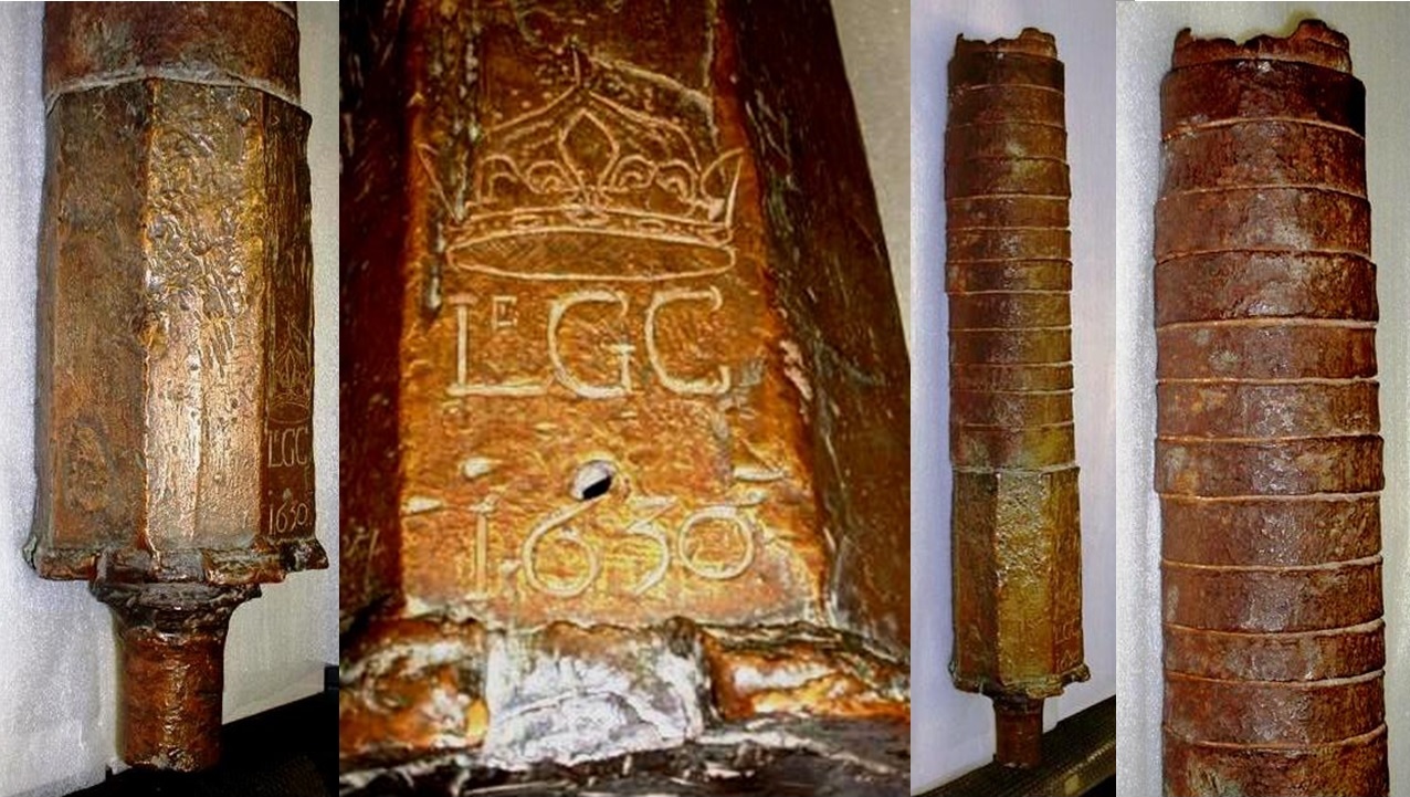 Bronze and Iron Smoothbore Muzzleloading Gun, known as the “Penetang Gun”, stamped 1630, LeGC with a crown above the breech.  The initials stand for “Le Grand Condé” who served under Prince Louis II as Captain General of the French Army in the mid-17th century.  The gun’s breech is made of Bronze which has been cast in a hexagonal shape.  Its iron barrel is reinforced with iron hoops.  The chase and breech-ends of the cannon are of separate construction.  The wrought iron construction of the chase is associated with guns of the late 15th and early 16th centuries.  The octagonal section of the cast bronze breech and the shape of the cascabel also indicate a date in the first half of the 16th century.  To be operational it would have been strapped with iron bands or strong ropes onto a wooden bed, which could itself be mounted on a yoke or carriage.  The gun would have been brought to Sainte-Marie by the Militia hired to protect the Jesuit Mission.  The gun is reputed to have been found in 1919 by Mr.  King of Christian Island which links it with the Jesuit missionaries who fled Sainte-Marie I in 1649.  The missionaries and a large group of Huron people spent the winter of 1649-50 establishing Sainte-Marie II on Christian Island, in Georgian Bay.  (Sainte-Marie among the Hurons Midland, Ontario.  Ministry of Tourism and Culture, Data and Photos)