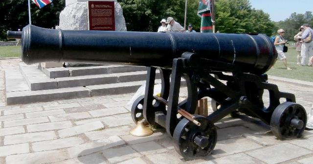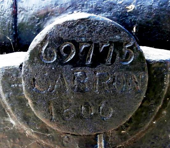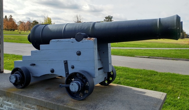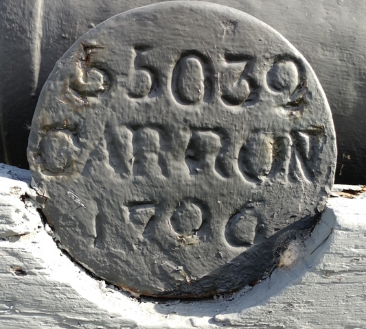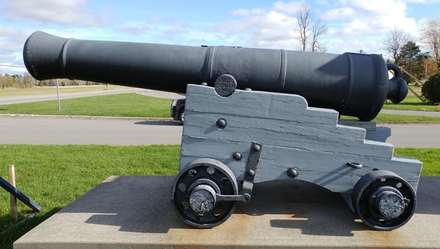 Blomefield Cast Iron 32-pounder 56-cwt Smoothbore Muzzleloading Gun, weight 55-3-0 (6,244 lbs), (Serial No. 55032, CARRON 1796) Carron of Falkirk, Scotland, on the left trunnion, (32P) on the right trunnion, King George III cypher, broad arrow mark, mounted on a wood Naval gun carriage.  No. 3. This gun is located at the entrance to the Crysler’s Farm Memorial.