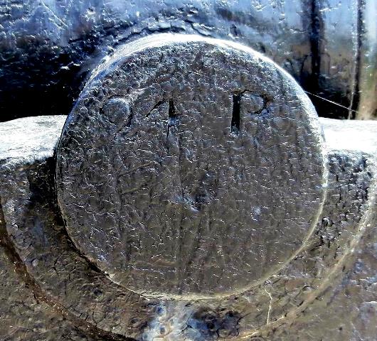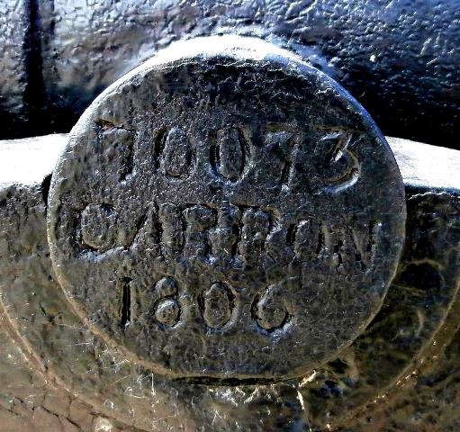Blomefield Cast Iron 24-pounder 50-cwt Smoothbore Muzzleloading Gun, weight 51-0-24 (5,736 lbs), (Serial No. 69775, CARRON, 1806) Carron of Falkirk, Scotland, on the left trunnion, (24P) on the right trunnion, King George III cypher, broad arrow mark, mounted on an iron garrison carriage.  No. 2 of 2.  This gun is mounted East of the monument at the Crysler’s Farm Memorial.