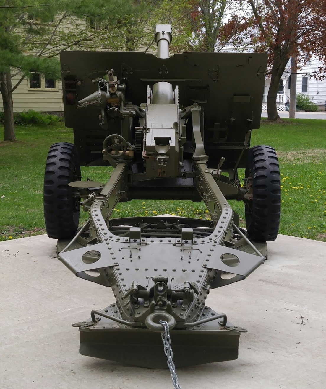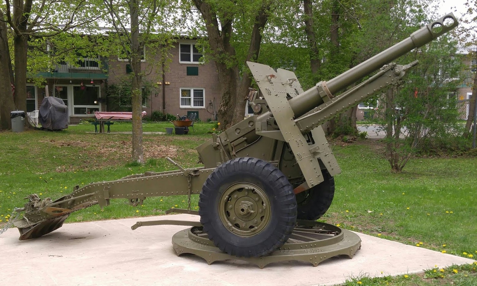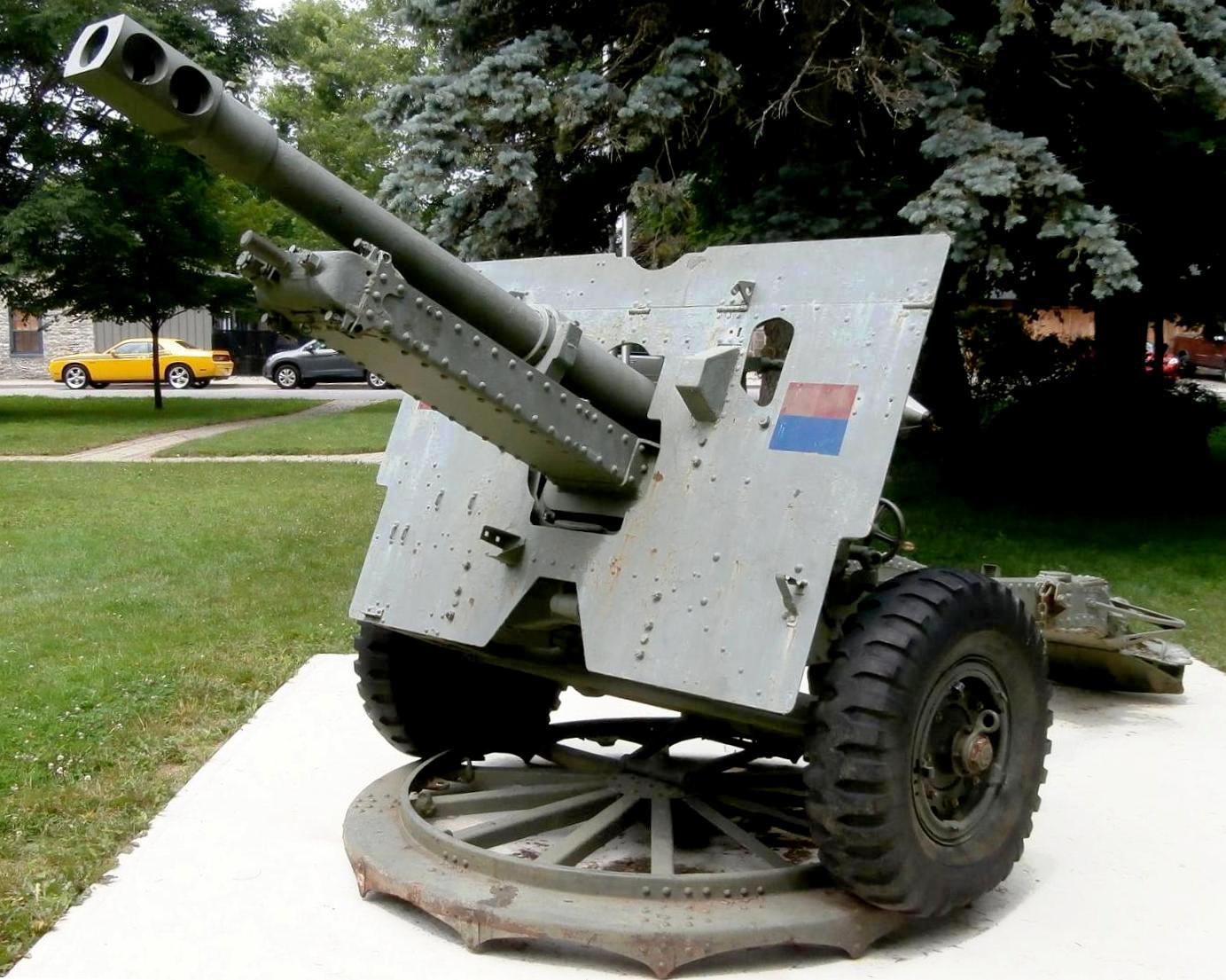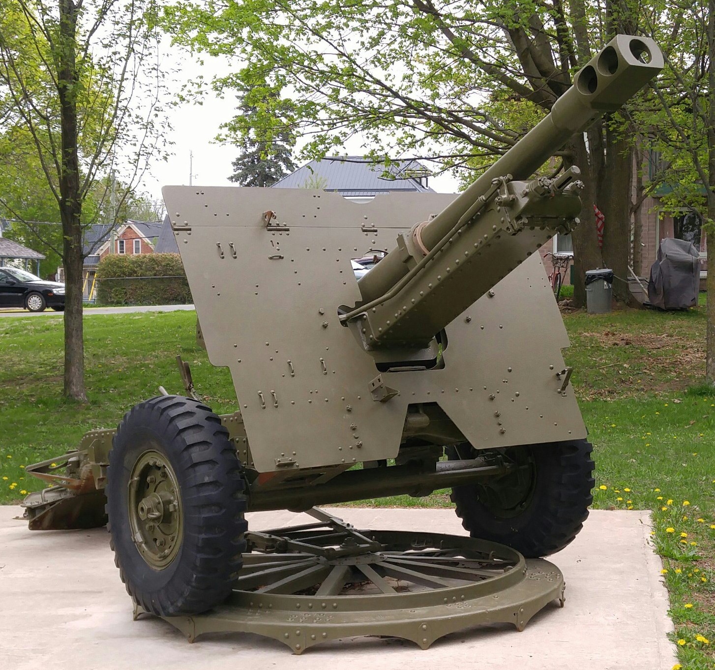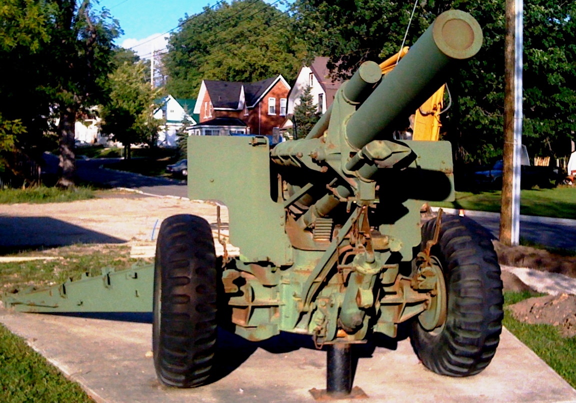 155-mm C1 (M1A2) Medium Howitzer on M1A2 Carriage, aka M114, manufactured at Sorel Industries Limited in Quebec, Queen Elizabeth II cypher.  CFR 34446.  The carriage plate reads: CARR. HOW. 155MM M1A2 CDN. SOREL INDUSTRIES LTD. CANADA (year unknown), REG. NO. CDN 168, INSP (symbol).  This gun stands in front of the Royal Canadian Legion, Branch No. 80.