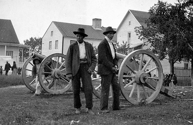 Bronze cannon at Moose Factory, Ontario with two Cree men, 1905.