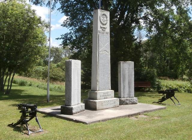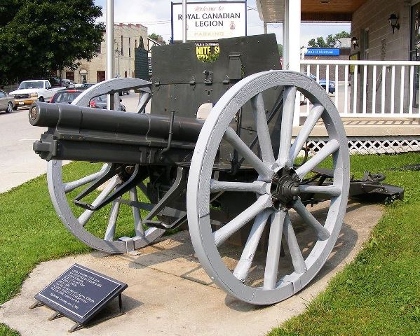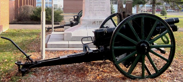 German First World War 7.7-cm Feldkanone 96 neuer Art (7.7-cm FK 96 n.A.), (Serial Nr. 1323),  Kaiser Wilhelm I cypher, no data.  This gun stands beside the First World War Memorial in front of the South Dundas Justice Building.  (One 10.5-cm gun was allocated to Morrisburg; it is not one of these).