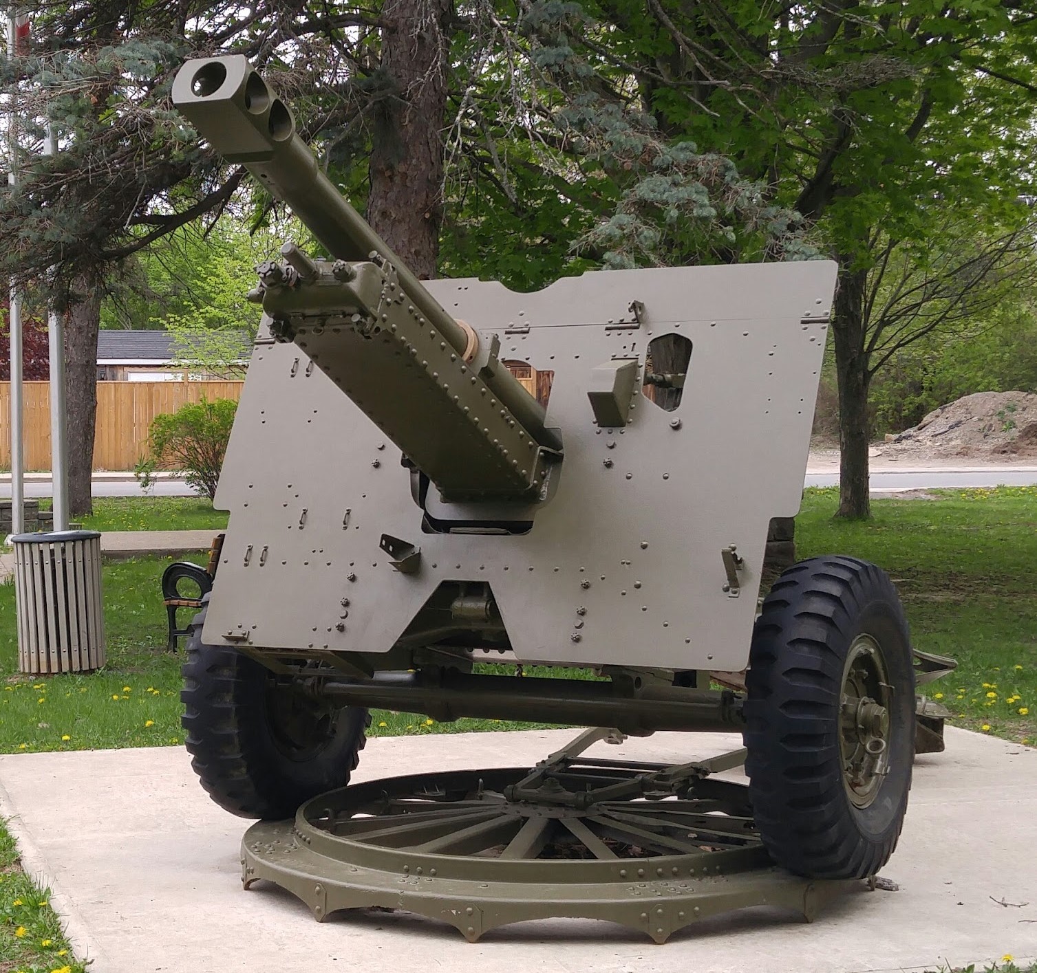 Ordnance Quick-Firing (QF) 25-pounder (87.6-mm/3.45-inch) Field Gun, C Mk. 2 with No. 9 circular firing platform, standing at the cenotaph.