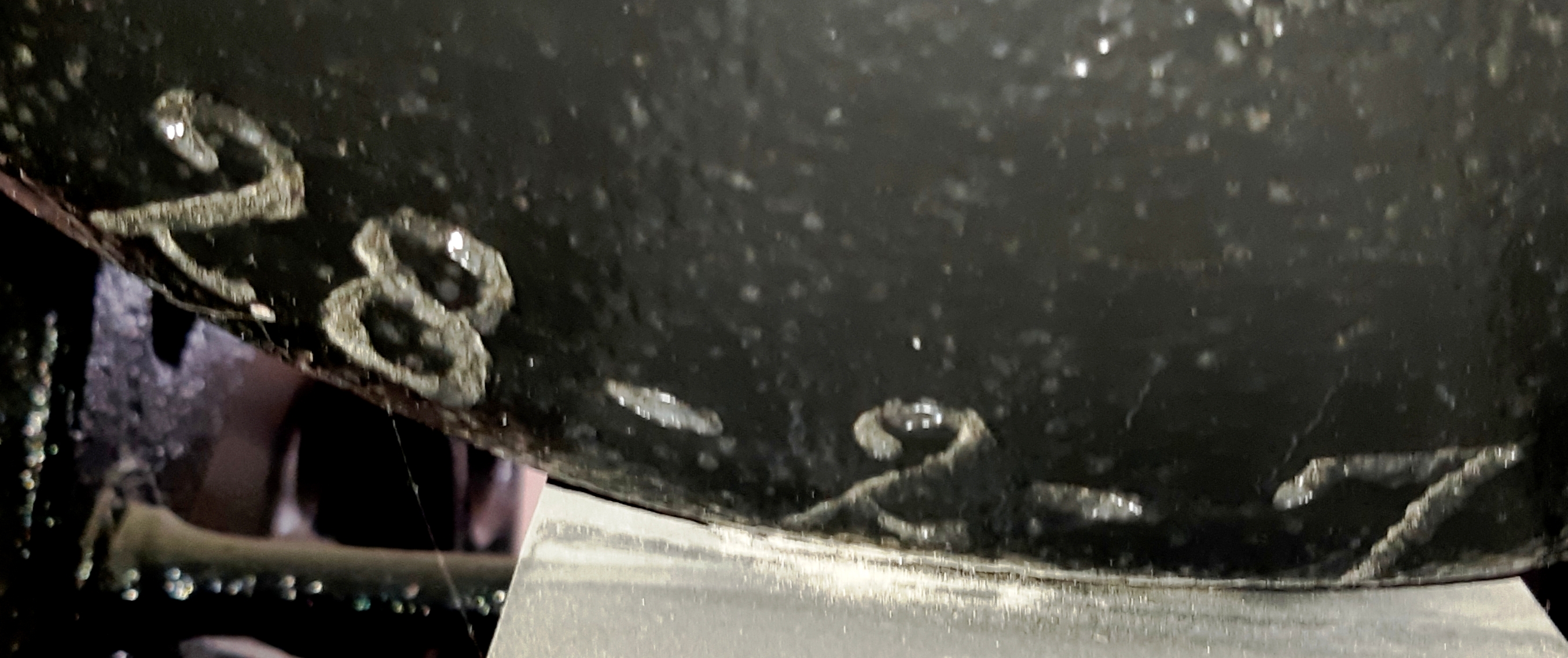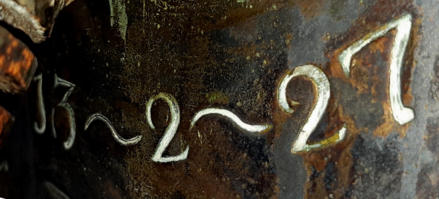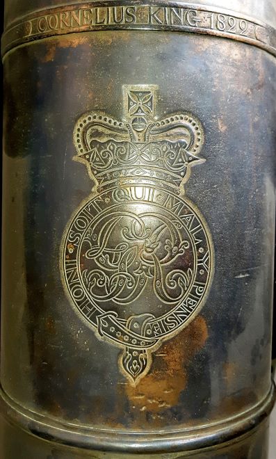 The cypher is engraved (not etched), probably freehand.  The centre of the garter is the Kabul Arsenal logo, which appears on the Afghan Martini rifles.  This [links] it to Abdur Rahman, who had the arsenal built about 1887.  His bio on wiki does not indicate a member of the Order of the Garter, so the cypher is probably fanciful.  Difficult to positively link the arsenal with artillery production.  The lettering is “a mixture of Dari and Kufic script”, which [as is] makes no sense, but experts are still working on it. (Doug Knight)
