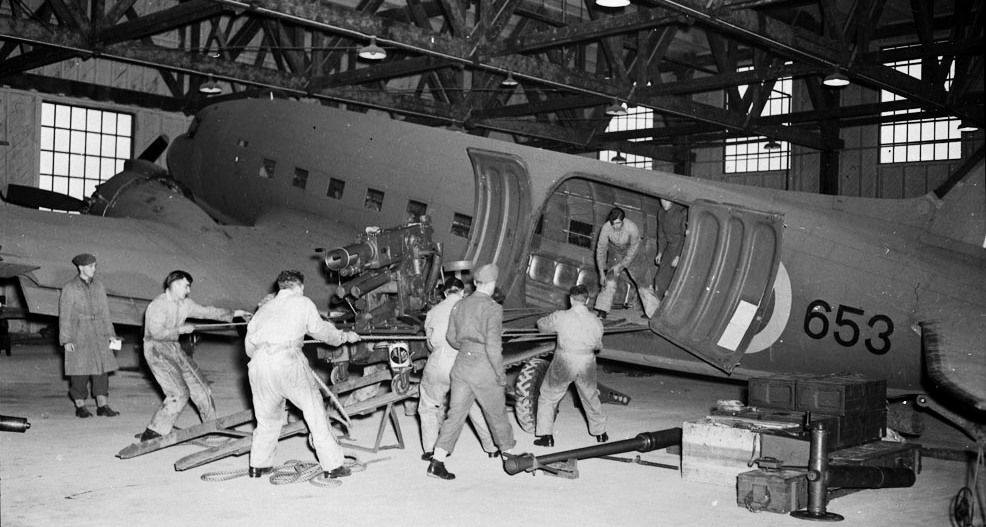 Bofors 40-mm AA Gun being loaded into a Douglas Dakota Mk III, RCAF (Serial No. 653), No. 12 (Communications) Squadron, RCAF Station Rockcliffe, Ontario, 28 Oct 1943.
