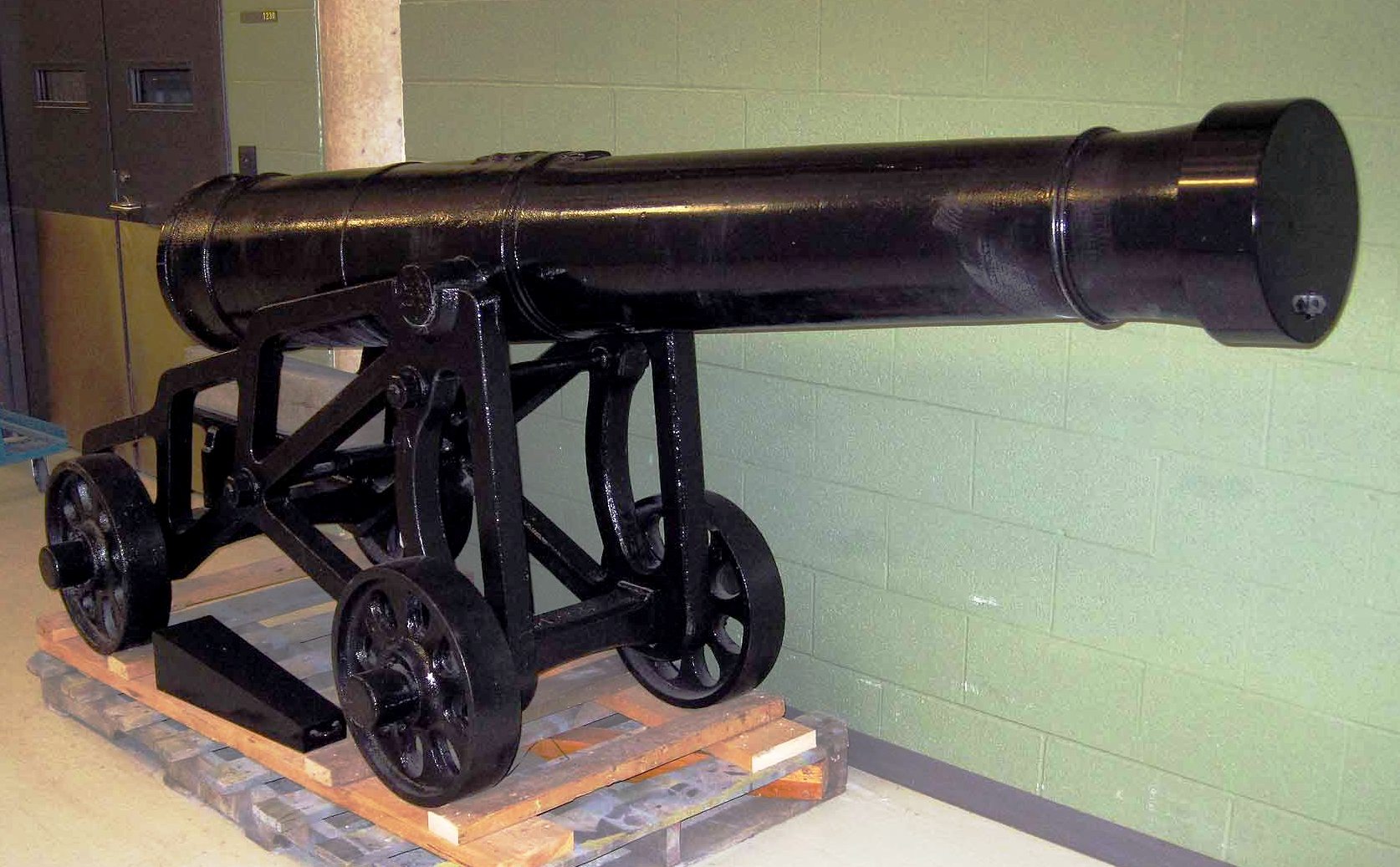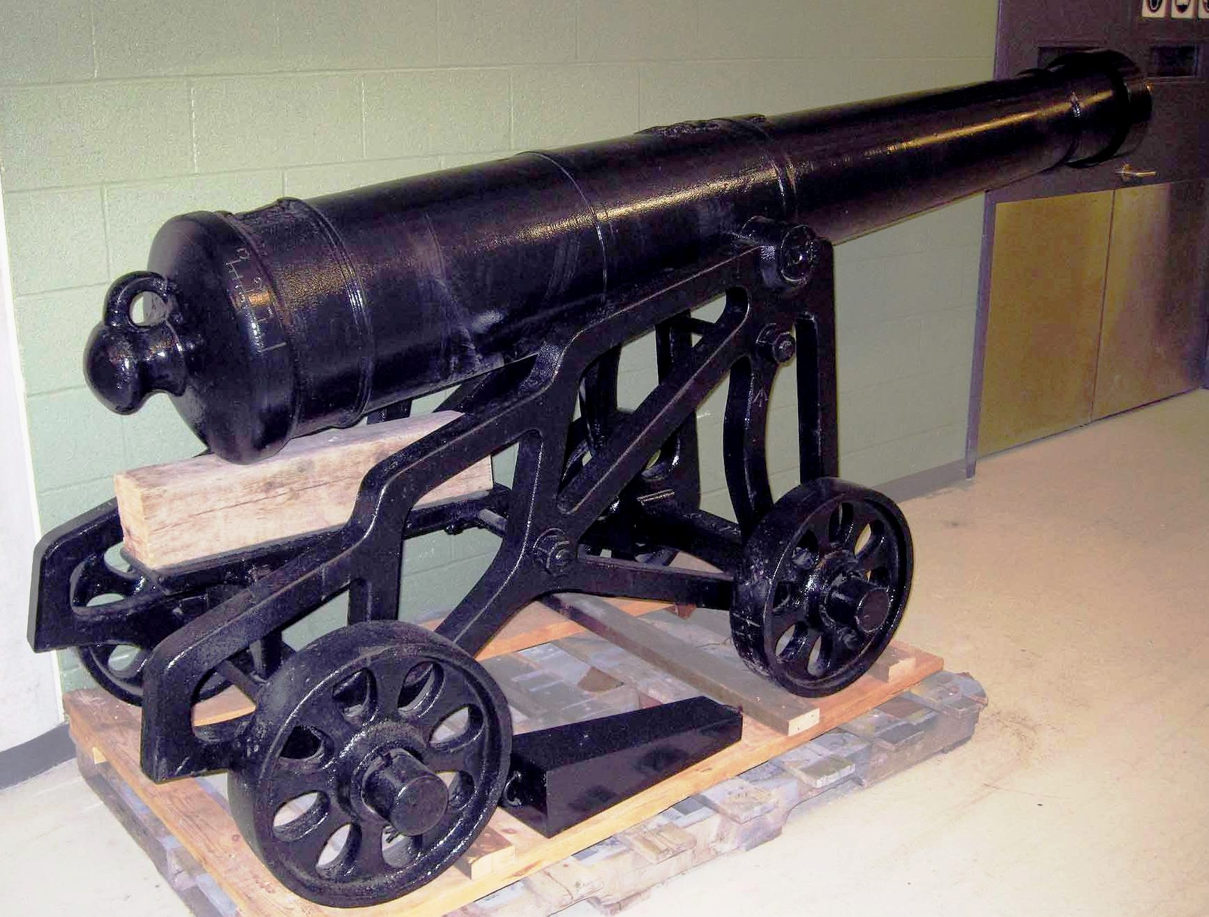 Blomefield Cast Iron 9-pounder Smoothbore Muzzleloading Gun, weight 28-2-7 (3,119 lbs) under the cascabel, (WCo) (Walker & Company) on left trunnion, (Serial No. TBC) on right trunnion, King George III cypher, broad arrow mark, mounted on an iron garrison carriage.  This gun was on display at Major’s Hill Park looking towards Parliament Hill.  It is currently in storage at the Canadian War Museum.