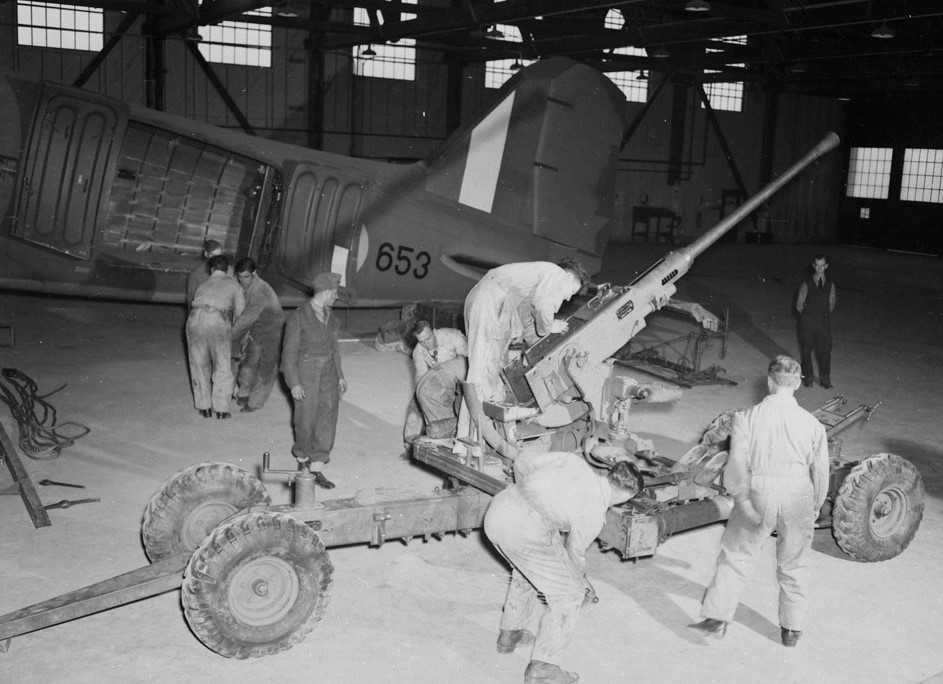 Bofors 40-mm AA Gun being prepared for loading into a Douglas Dakota Mk III, RCAF (Serial No. 653), No. 12 (Communications) Squadron, RCAF Station Rockcliffe, Ontario, 27 Oct 1943.