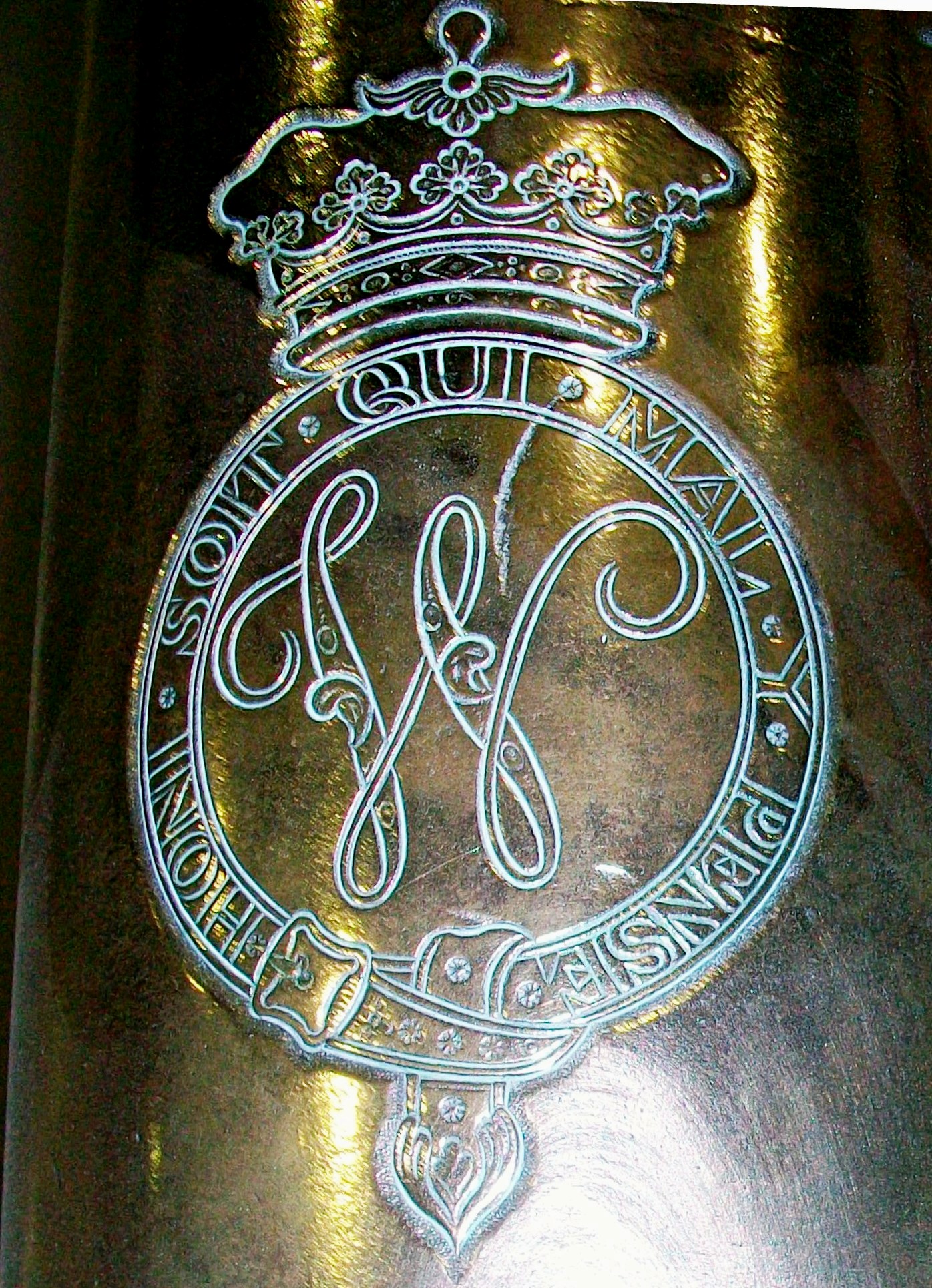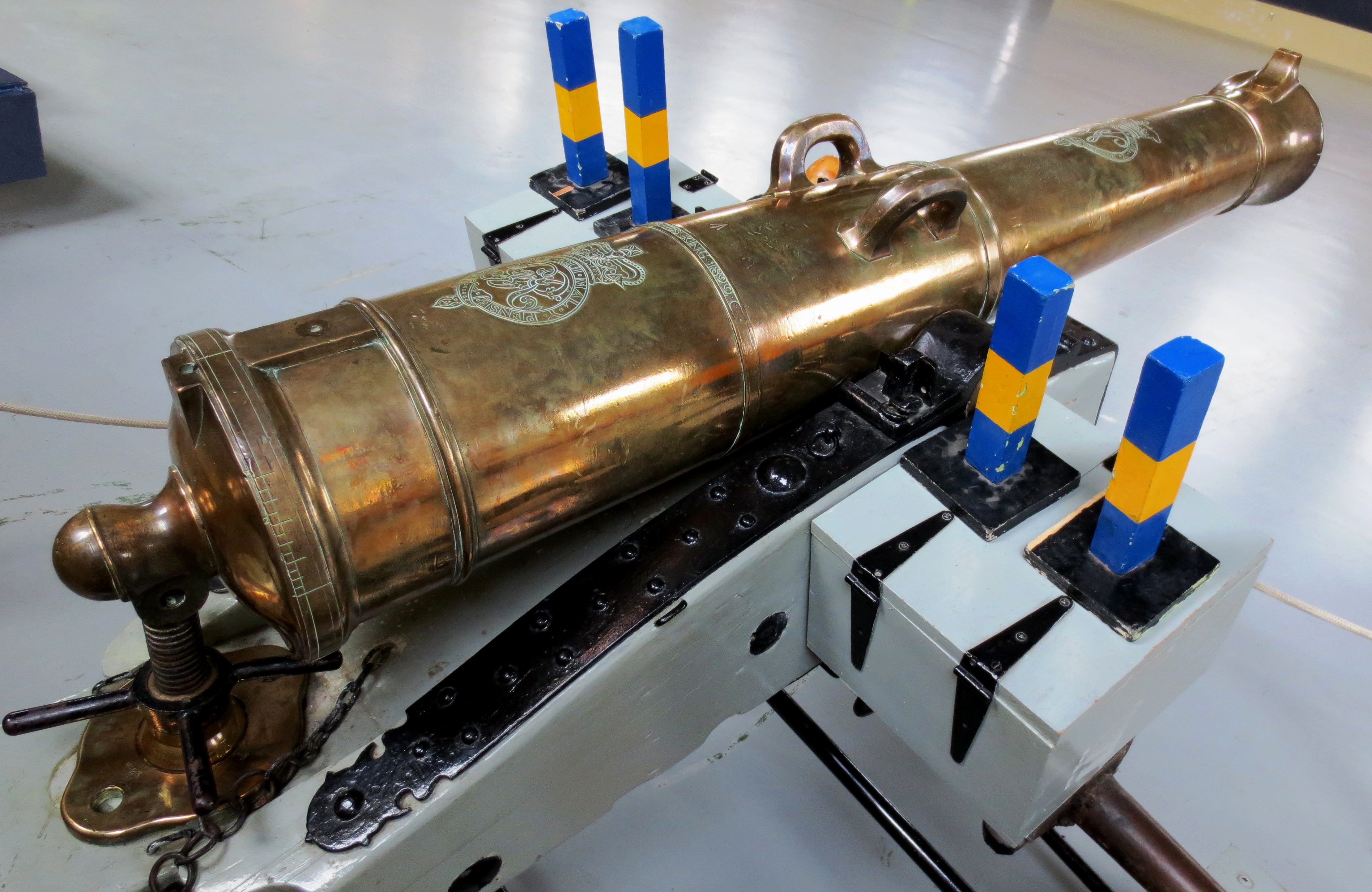 Bronze 9-pounder Smoothbore Muzzleloading Gun with carrying handles, weight 13-2-27 (1,519 lbs), 1822, King George IV cypher and a second cypher W with crown & belt, Honi Soit Qui Mal Y Pense (cypher for Arthur Wellesley, Duke of Wellington), and the Roman numerals DCCXLIV (744), mounted on a wooden carriage marked 1858.  This gun was previously on display in the Hastings and Prince Edward Regiment Armoury.