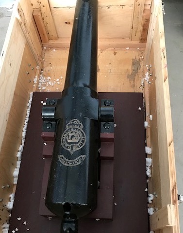 Blomefield pattern 9-pounder Smoothbore Muzzleloading Gun, weight 28-2-7 (3,119 lbs) under the cascabel, (WCo) (Walker & Company) on left trunnion, (Serial No. TBC) on right trunnion, King George III cypher, broad arrow mark, mounted on an iron garrison carriage.  30th Field Regiment.