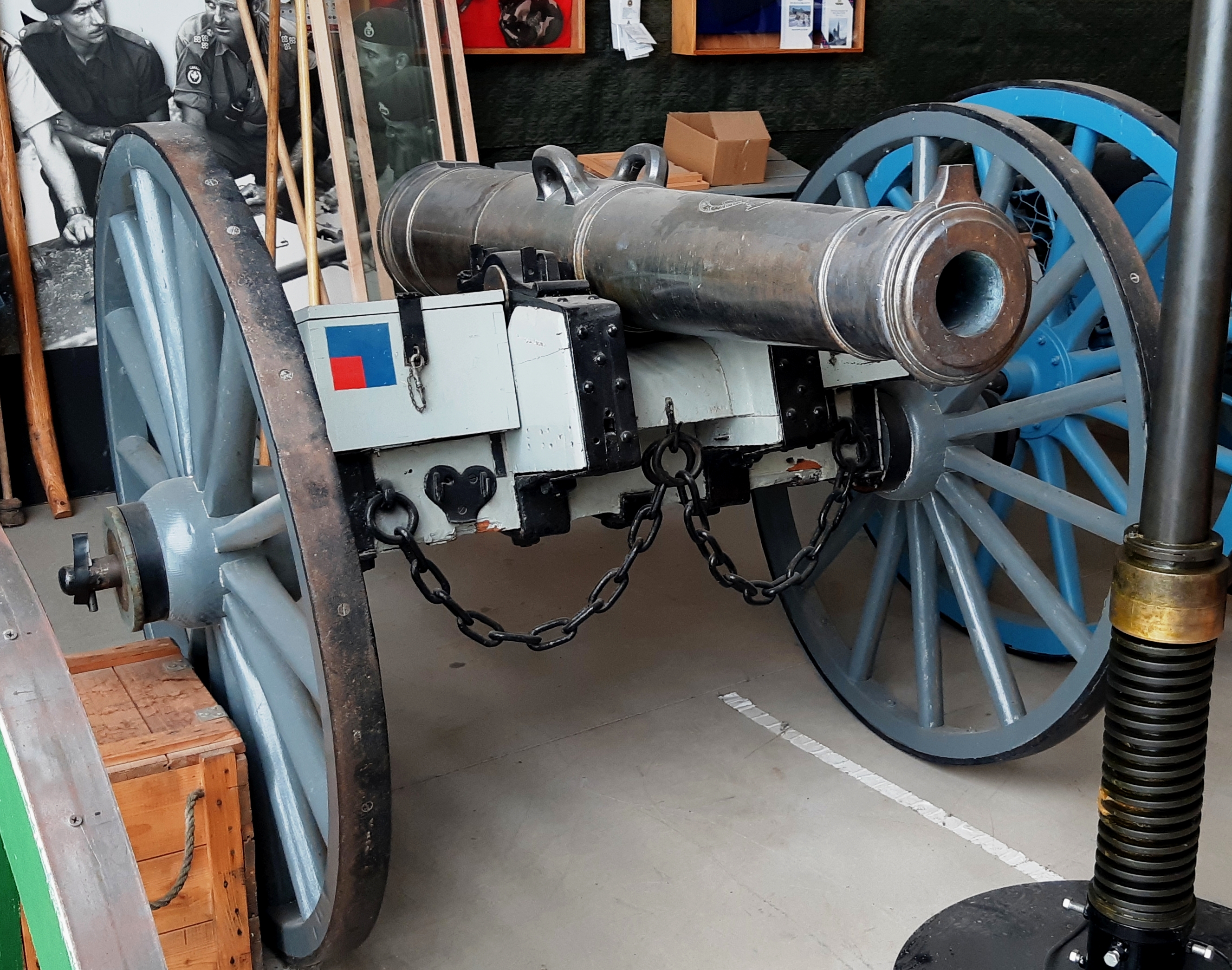 Steel 7-pounder Mk. IV muzzleloading rifle (MLR) replica, similar to guns used as pack howitzer in India in the late 1800s.  The type entered service in 1873 and apparently most of them were sent to India.  There were six in Canada, with two in service with the NWMP.