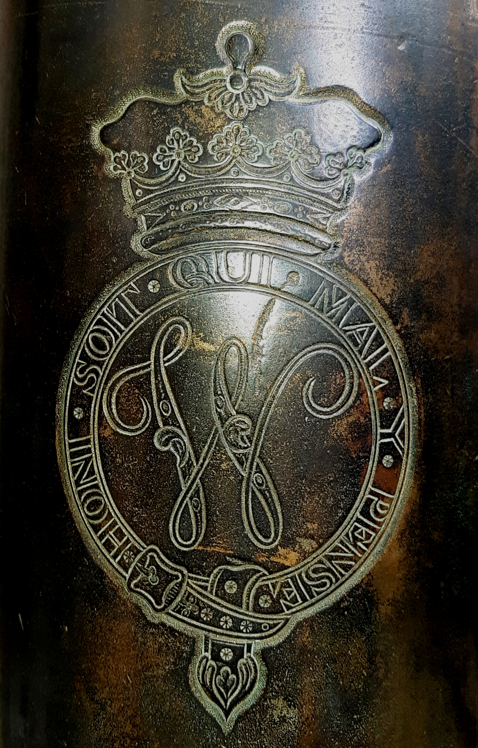 This gun is a replica/reproduction. The front sight is a solid plug, there is no vent (touch hole), and since it is about 75 pounds overweight, it is possible that the barrel is only bored out for the first three inches and then has an insert to give the impression of a plug.  Externally, it is a reasonable dimensional copy of the Steel Mk. IV MLR, although it may have been cast using wrought iron and not steel.  There are no markings, except for the cypher and crescent moon.