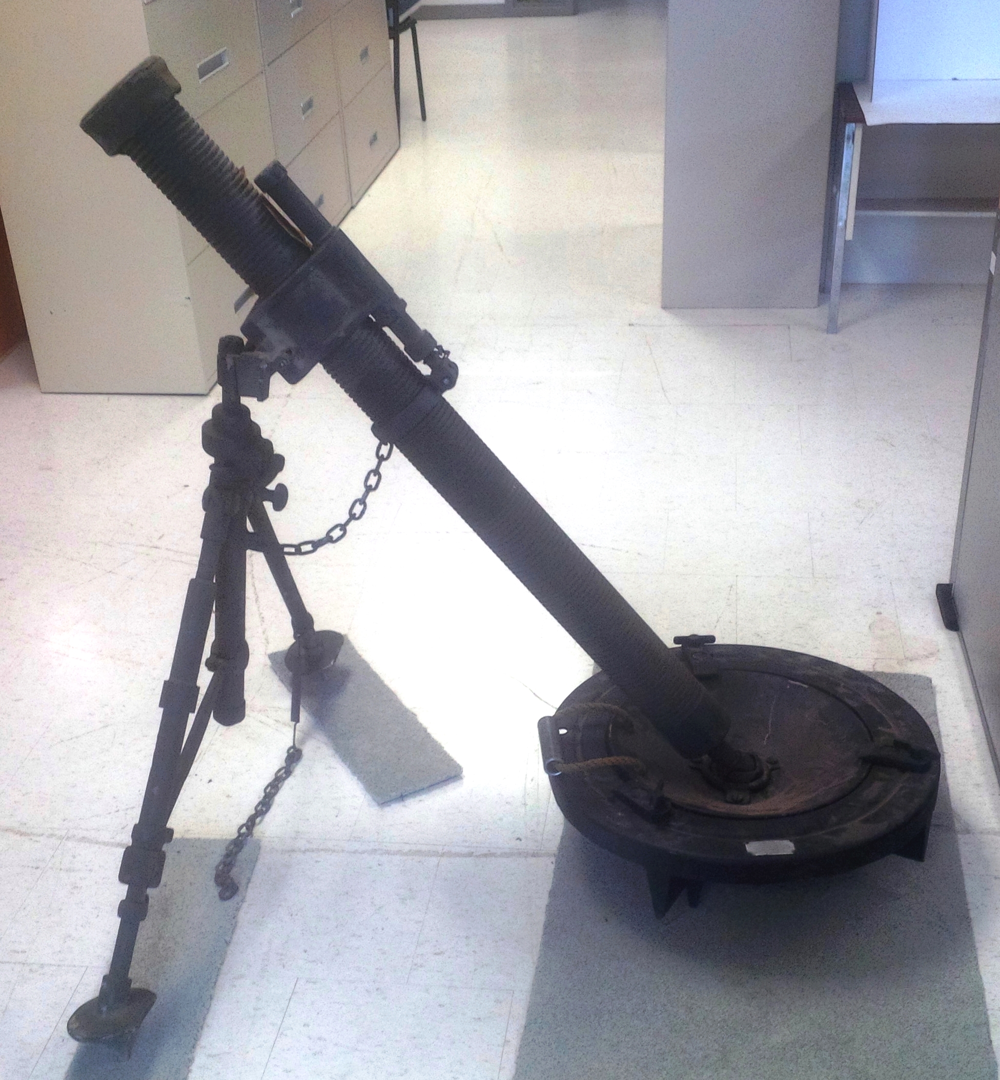 81-mm C3 Mortar, (Serial No. 8392) in service. The 81-mm mortar is an indirect fire support weapon. It has the tactical advantage of a high trajectory, which allows it to be sighted and engage targets from behind cover and provide overhead support to friendly troops.  The mortar consists of a monobloc steel barrel with a smooth bore.  The supported barrel in the bipod mount allows it to elevate, depress and cross the mortar within specified limits.